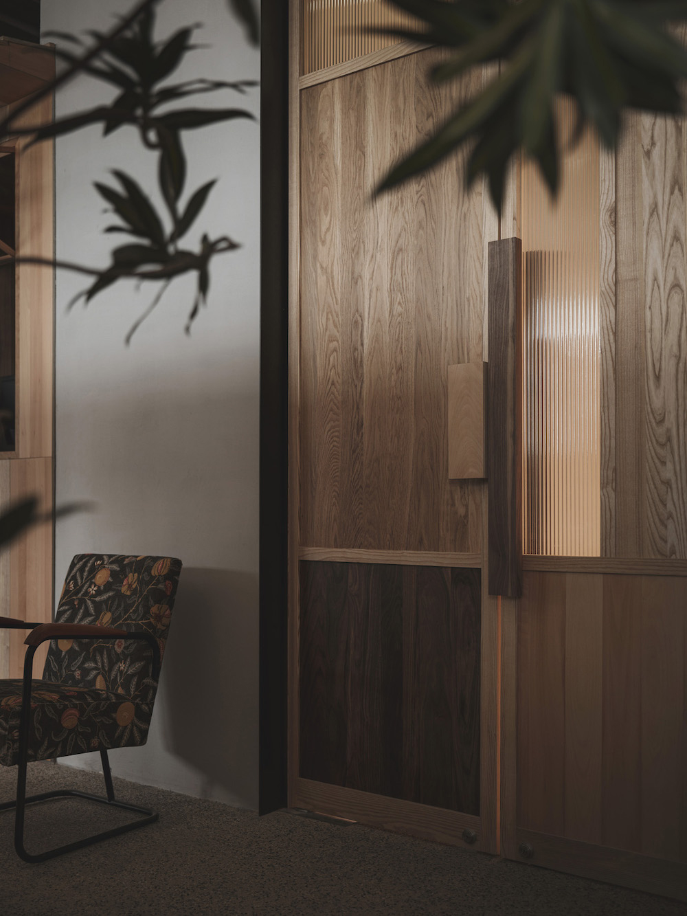 当顾客通过展示空间时,可以看到带有斜屋顶的客舱。小屋将容纳商店活动和临时展览项目。以杭州茶园为灵感,我们意在营造一种人与自然和谐共生的感觉。两道石阶连接小屋与展示空间,呈现出温馨轻松的景象:人们聚集在小屋内,而其他人则在大自然的屋檐下休息。客舱的立面提供了一种开放感,因为木框架推拉门在视觉上将客舱与展示空间轻轻隔开。客舱的地板、墙壁和天花板采用五种不同的木材(山毛榉木、胡桃木、白橡木、樱桃木和白蜡木);都是品牌在家具制作中使用的材料。不同木材类型的融合延伸到木质推拉门和商店入口的详细设计。通过实木材料的实践,我们试图与品牌的家具系列形成对话。木材的自然纹理赋予空间温暖和柔情。