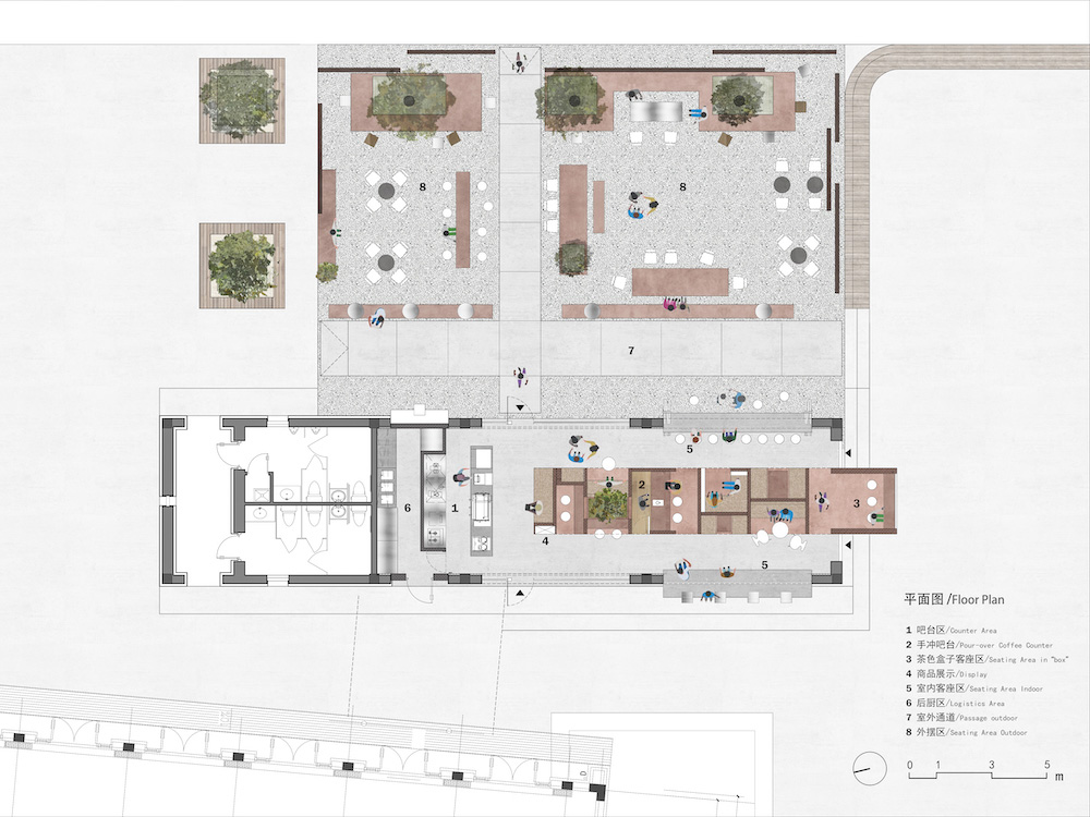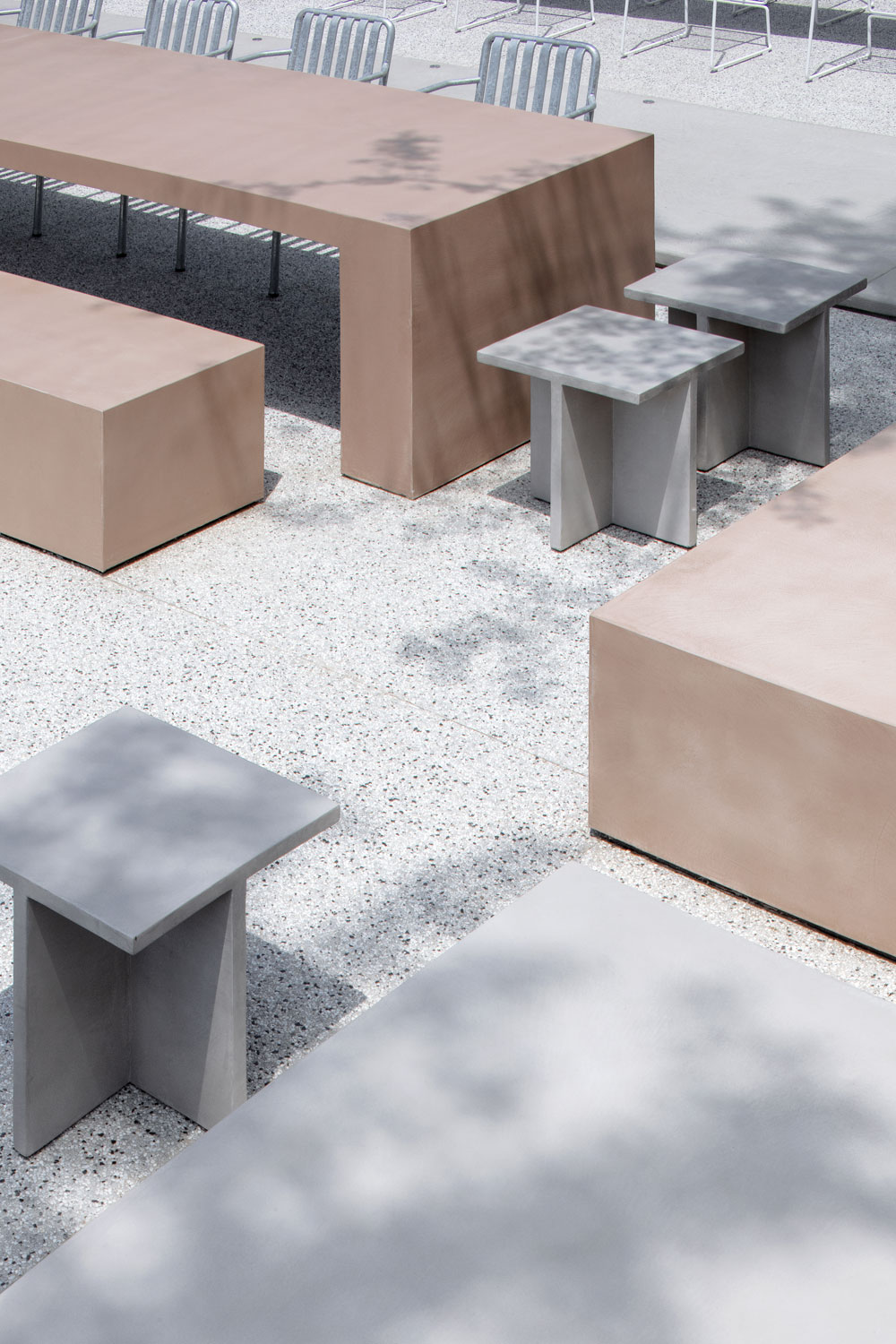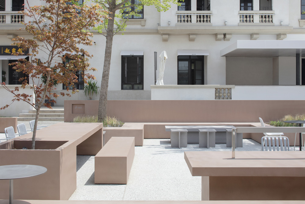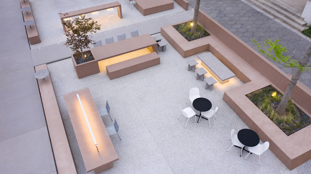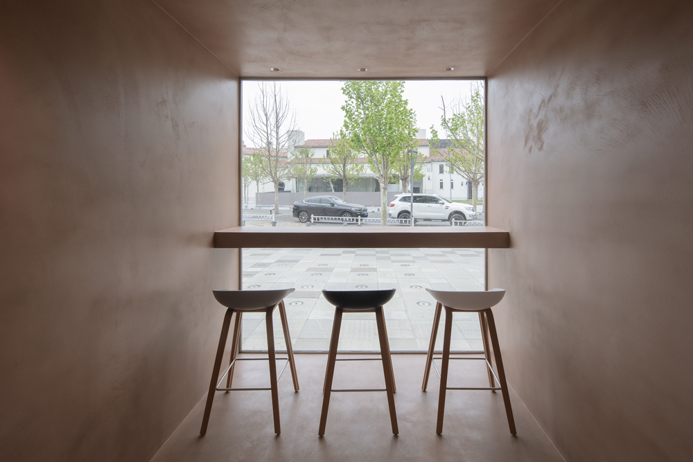 The cross-shaped outdoor platform helps maintain a visual continuity between indoor and outdoor, meanwhile dividing the outdoor seating into four areas. The fixed furniture of the exterior is made of the same pigmented Dagu cement with the interior cafe box, which strengthens the integrity and continuity of the interior and exterior. We strategically arrange outdoor partition walls with different heights, seating, tables and bar tables to create a sense of spatial enclosure and dynamic layering of space. In addition, the light grey exposed aggregate concrete for the exterior floors presents a soft and natural atmosphere of outdoor courtyard.