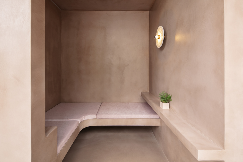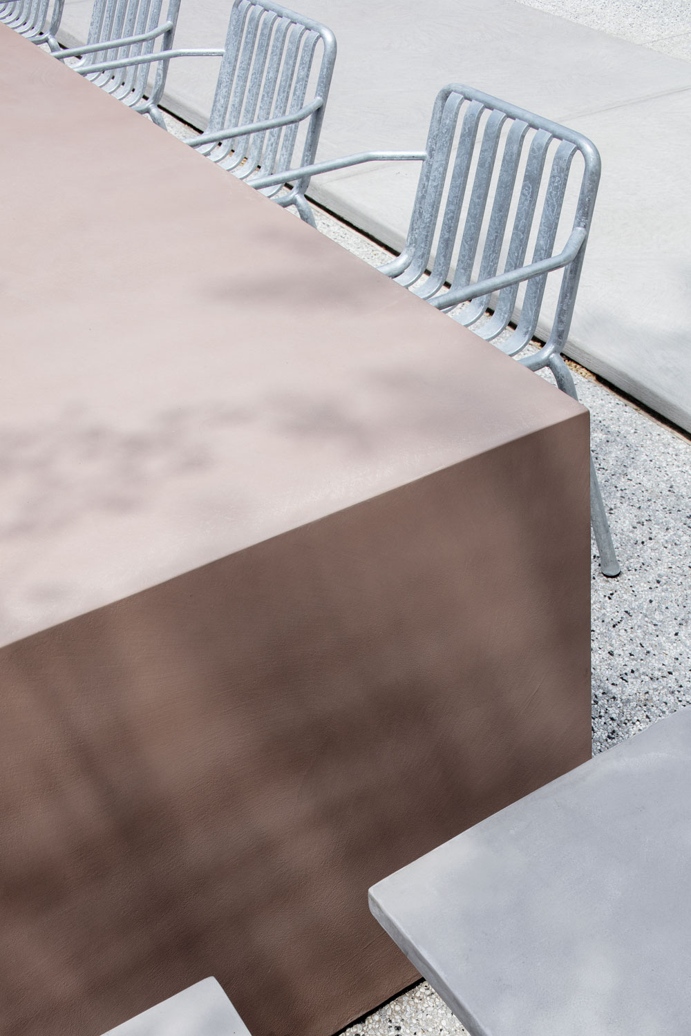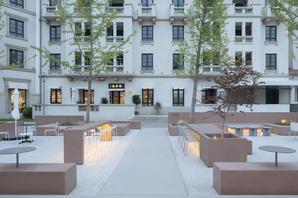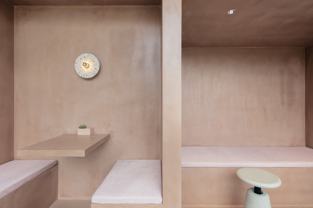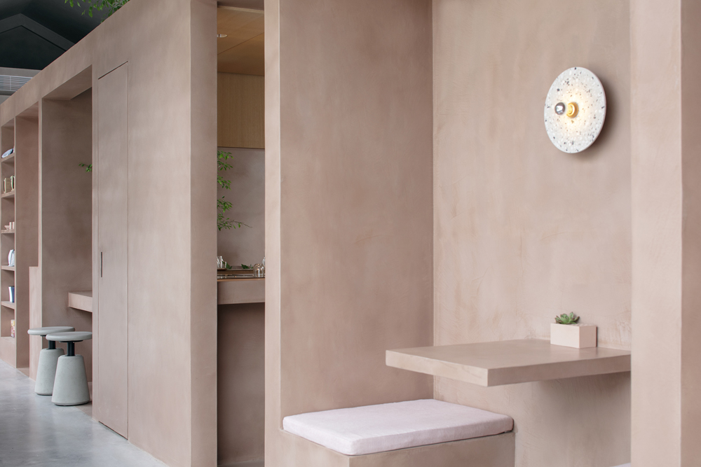 The cross-shaped outdoor platform helps maintain a visual continuity between indoor and outdoor, meanwhile dividing the outdoor seating into four areas. The fixed furniture of the exterior is made of the same pigmented Dagu cement with the interior cafe box, which strengthens the integrity and continuity of the interior and exterior. We strategically arrange outdoor partition walls with different heights, seating, tables and bar tables to create a sense of spatial enclosure and dynamic layering of space. In addition, the light grey exposed aggregate concrete for the exterior floors presents a soft and natural atmosphere of outdoor courtyard.