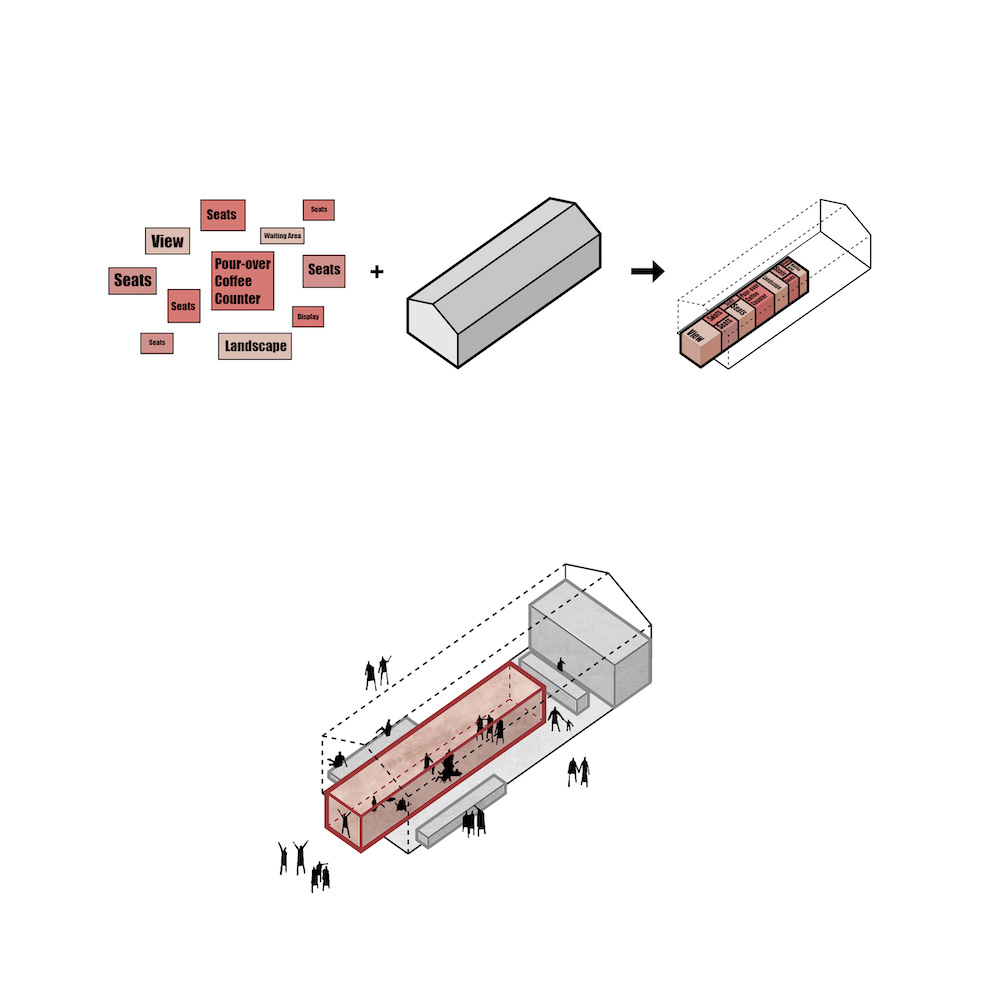 Within the interior space, we insert a new volume into the existing building. The rectangular box forms a new cafe experience that integrates the functional needs of seating, waiting area, pour over bar, display and landscape, while dividing the open space to offer guests a variety of spatial experience. The pigmented Dagu cement box extends to the street-facing facade of the red brick building, which defines a new visual focus for the originally dull facade, arousing the curiosity of guests to explore in the space.