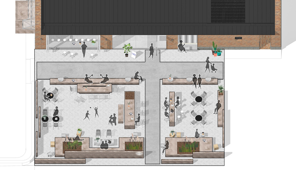 新的玻璃幕墙采用完全可操作的折叠门窗,面向广场和户外咖啡区,增加了室内外的互动。盒子的核心区域分为半私人座位和不同尺度的空间。空间策略为想要独处的客人和几个亲密的朋友提供舒适的规模感。