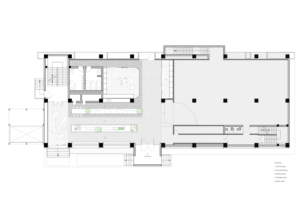 The transparent glass facade integrates the coffee shop into the environment of local streetscape, and meanwhile it draws both streetscape and cityscape into the shop. In this way, the greenery as well as the light and shadows have become intrinsic elements of the store. The bar counter is located at the center of the store. The greenery interspersed in the seating areas which scatter around the center zone, making the interior more natural and vibrant. The design continues the consistent minimalism aesthetic of the brand by choosing pale grey washed stone and plain cement as its basic tone. Highlighted by the tone, the greenery becomes a protagonist in the space and ultimately emphasizes our design motif. The dialogue with nature in this way is our attempt to blur the boundary between the interior and the exterior and to reveal a fusion between human and nature.