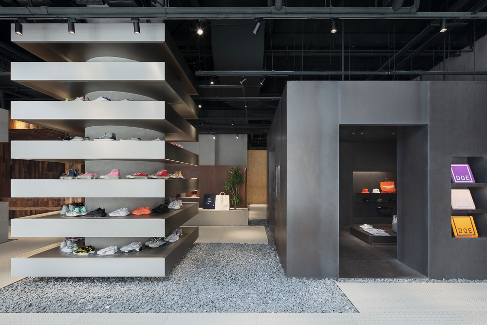 Different functional spaces like cafe, retail area and rest area are designed as boxes with different sizes. When people are walking in the store, they will get richer experience like walking on the street than just being indoors. The application of different materials such as metal, wood and brick not only reflects the richness and the embracement of city life, but also reflects DOE Culture.