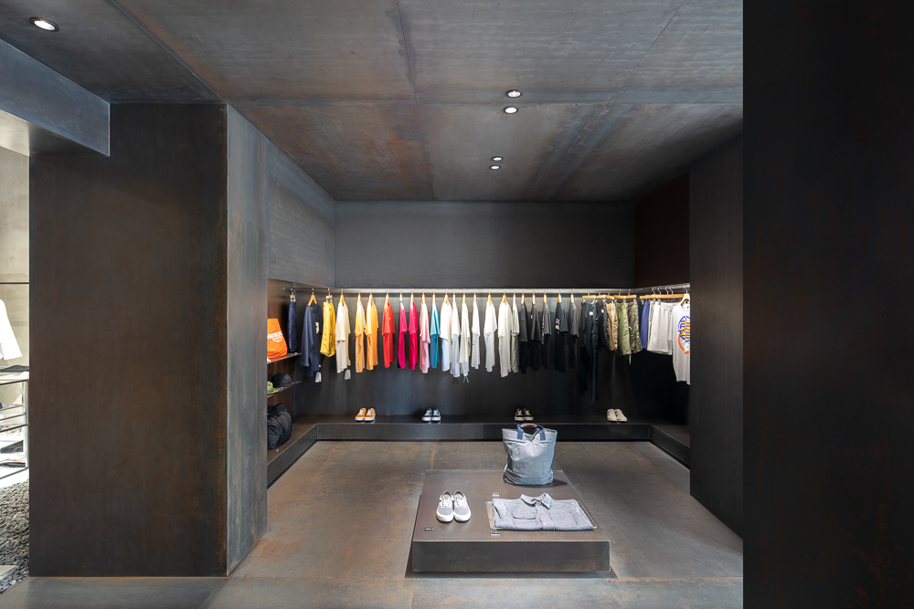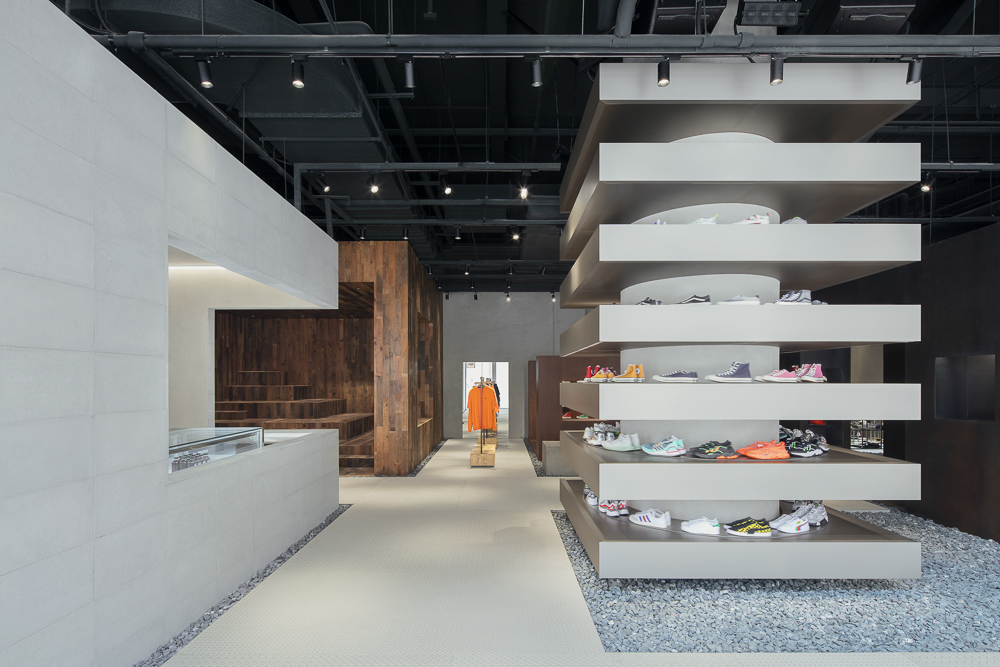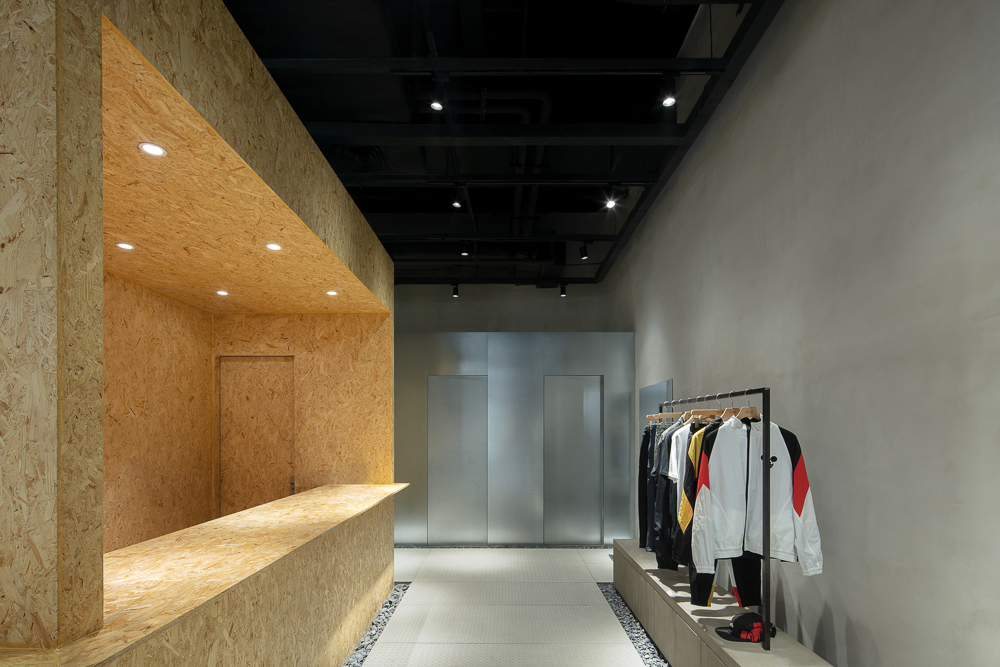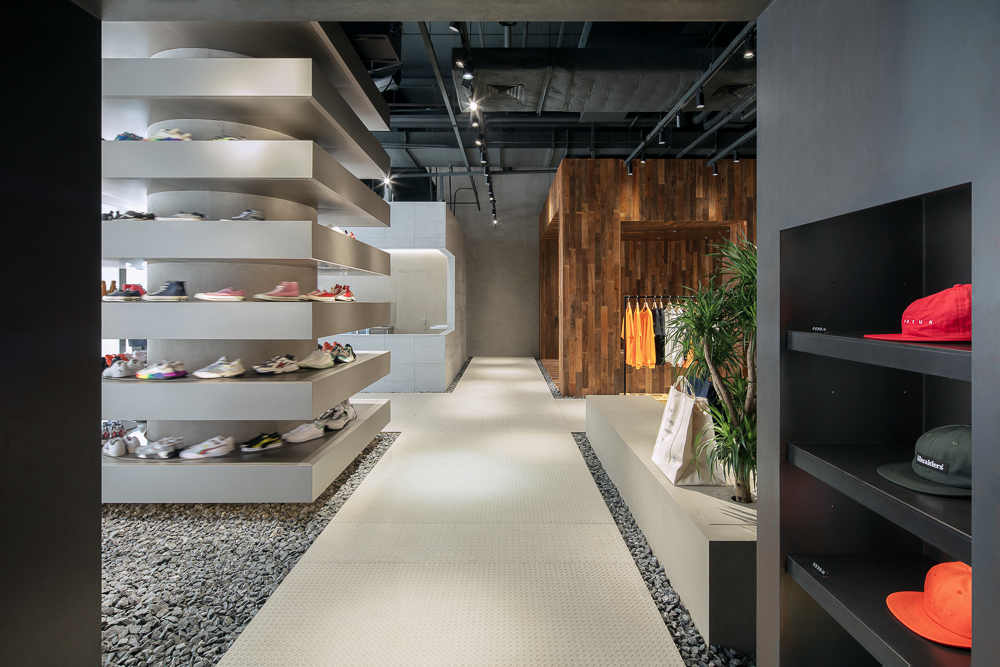 The display area for a product line and the rest area are surrounded by the stairs which are made by old woods. The rough feeling of the material not only improves the relaxing atmosphere for communication, but also reflects the spirit of uniqueness from street culture. The showcases made by rusty steel and acrylic break the boundary of the "boxes" with their more open design. The “rotating box" in the center of the store is a focal point which attracts customers to go inside.