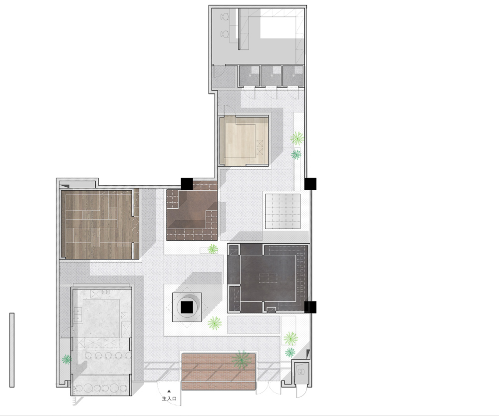 咖啡厅、零售区和休息区等不同的功能空间被设计成不同大小的盒子。当人们在商店里行走时,他们会获得比在室内行走更丰富的体验,就像在街上行走一样。金属、木材、砖块等不同材料的应用,不仅体现了城市生活的丰富和包容,也体现了DOE文化。