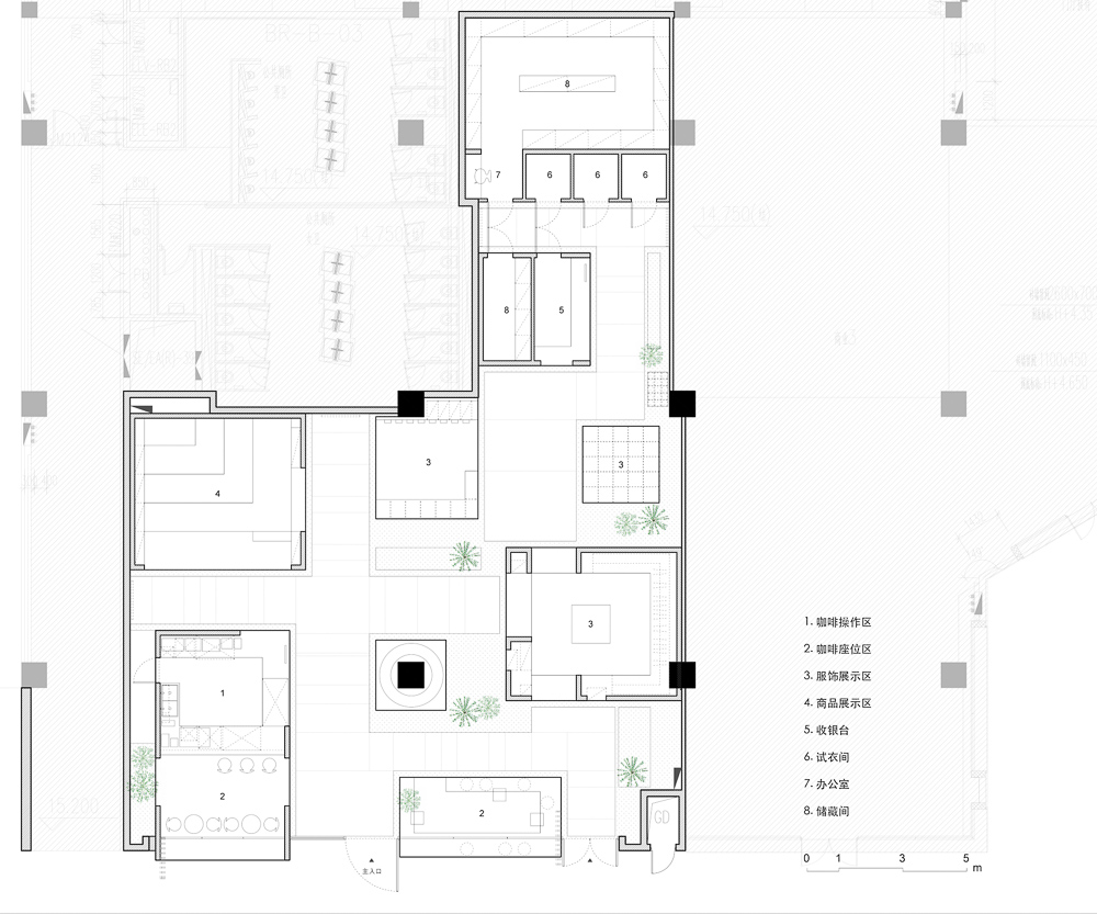 DOE新店位于深圳市福田区山坡商业中心UpperHills。该项目的最初概念是将自然引入室内空间。基于这个概念,设计在商店和外部空间之间展开了不同的对话。从外部到内部覆盖的连续金属地板在商店和街道之间建立了联系。而店面的开放式立面设计,不仅与城市共享其室内空间,也迎合了来自街头的景象。