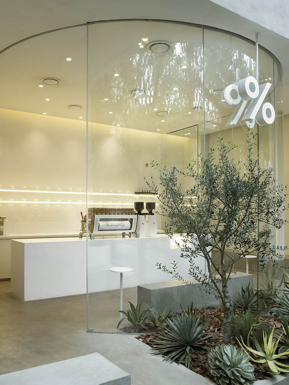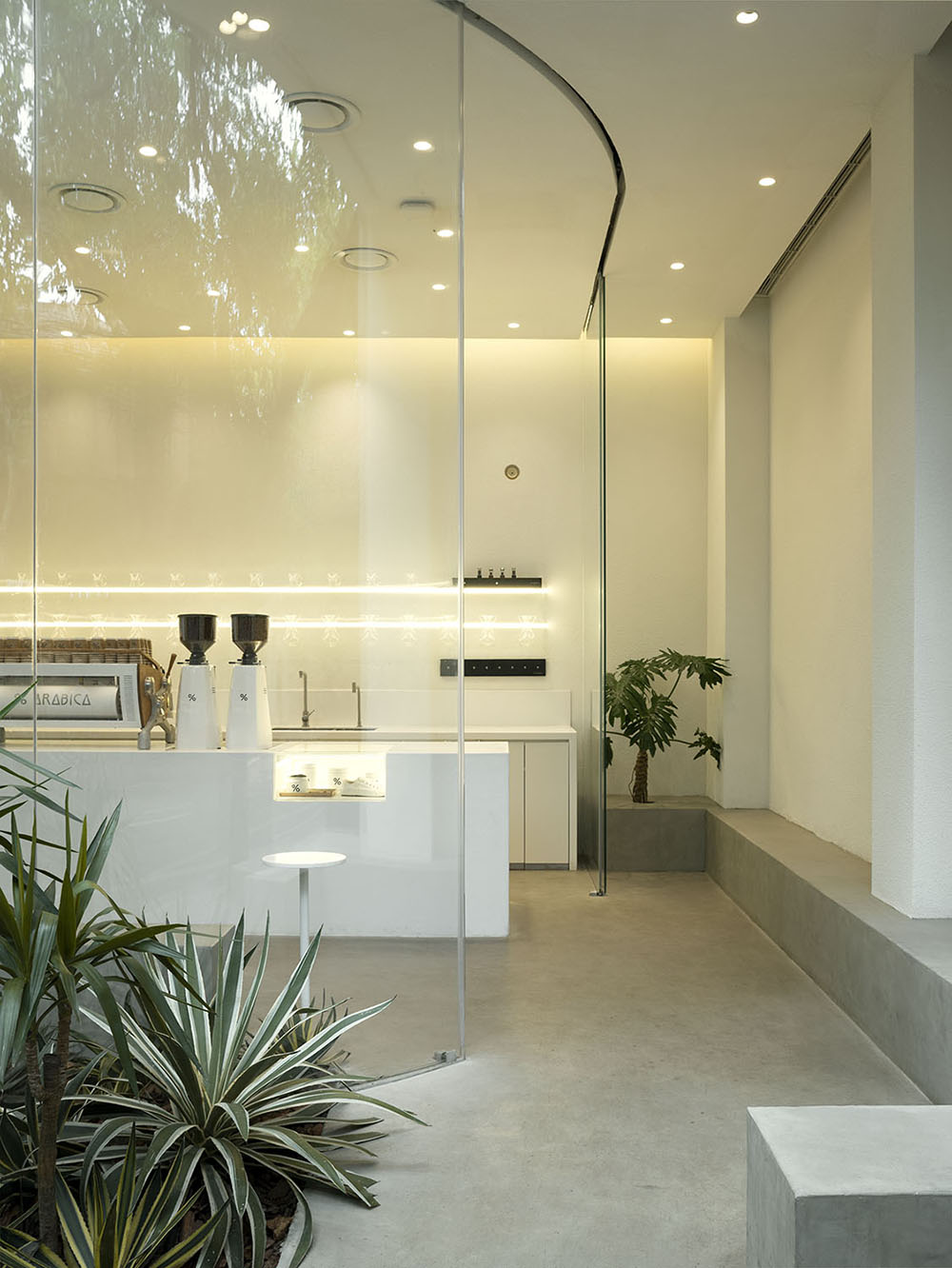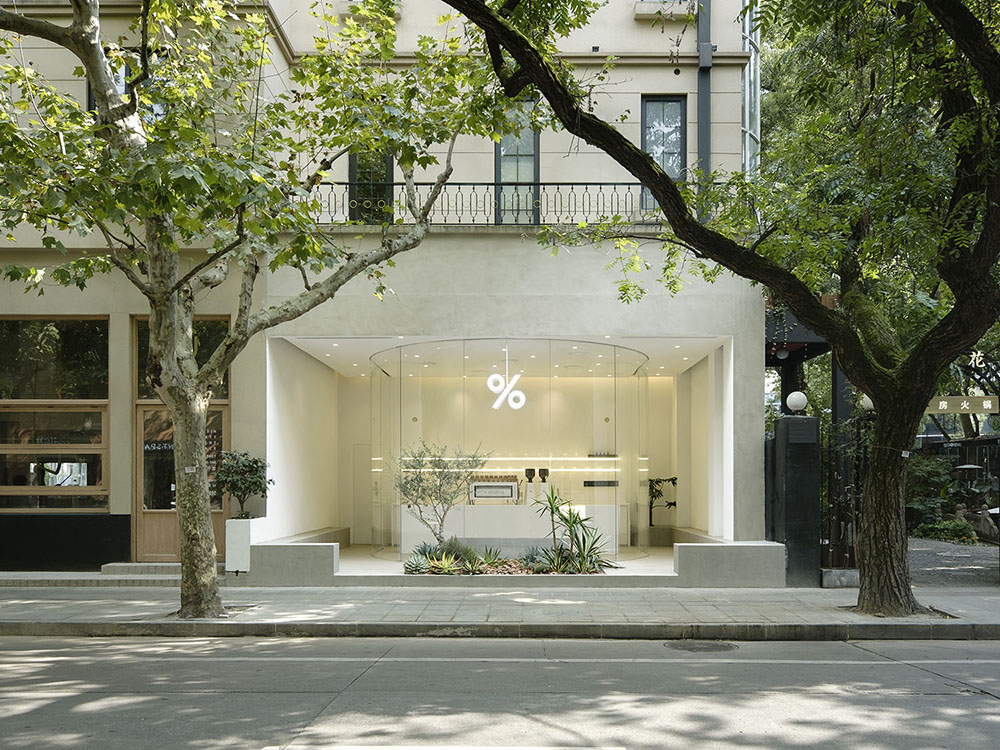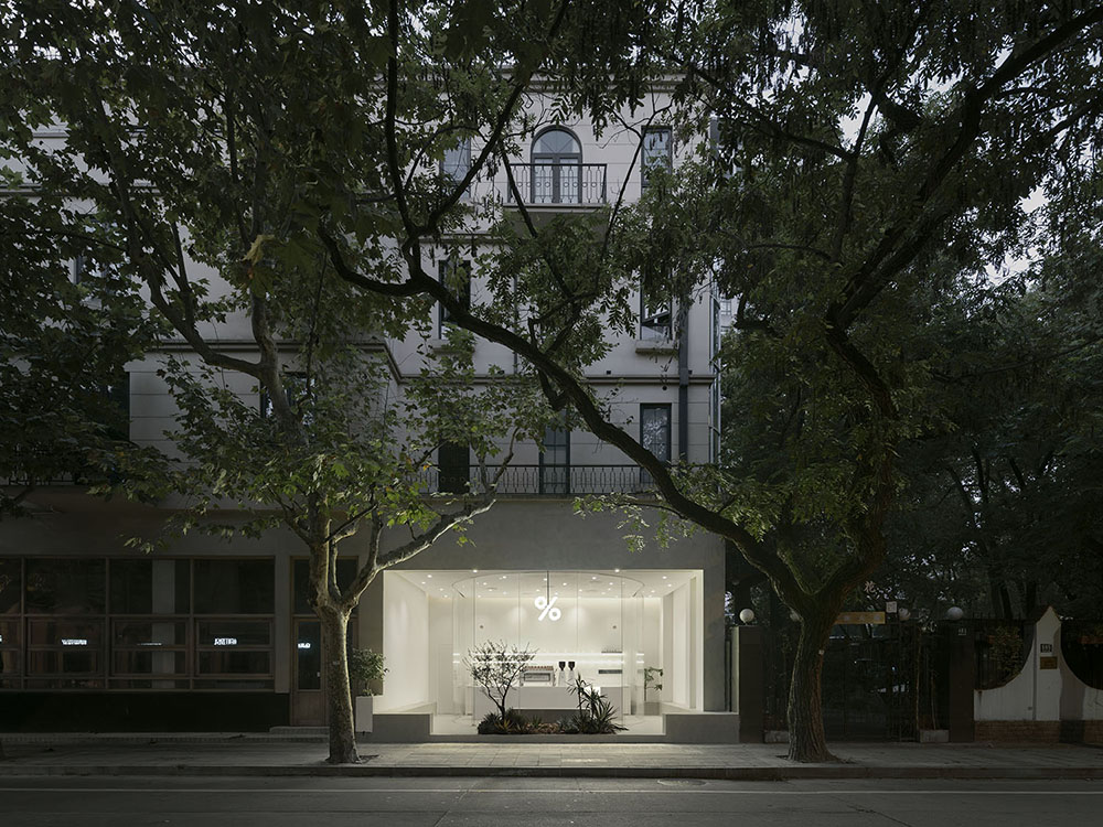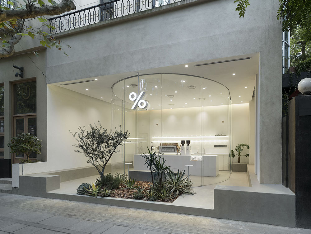 3. 面积50平米的店铺设计内容包括了室内和外立面的改造。外立面抛弃常规做法,而选择将空间彻底开放,形成一个围绕着U字型玻璃盒子的小小庭院。可以完全敞开的弧形玻璃门,以及从室外延伸进来的地面材质,最大程度的将室内外空间贯通为一个整体,模糊内外的边界。室内空间虽然不大,但也开辟出一方庭院,店内的小树和街道旁的梧桐树交相呼应,也是街道自然元素的延展。此外,为了保证店铺在不同季节的实用性,室外休息区也安装了空调,结合入口处的风幕机,一定程度的控制室内外冷热空气交换,让客人在冬日和夏日也能获得较舒适的体验。
