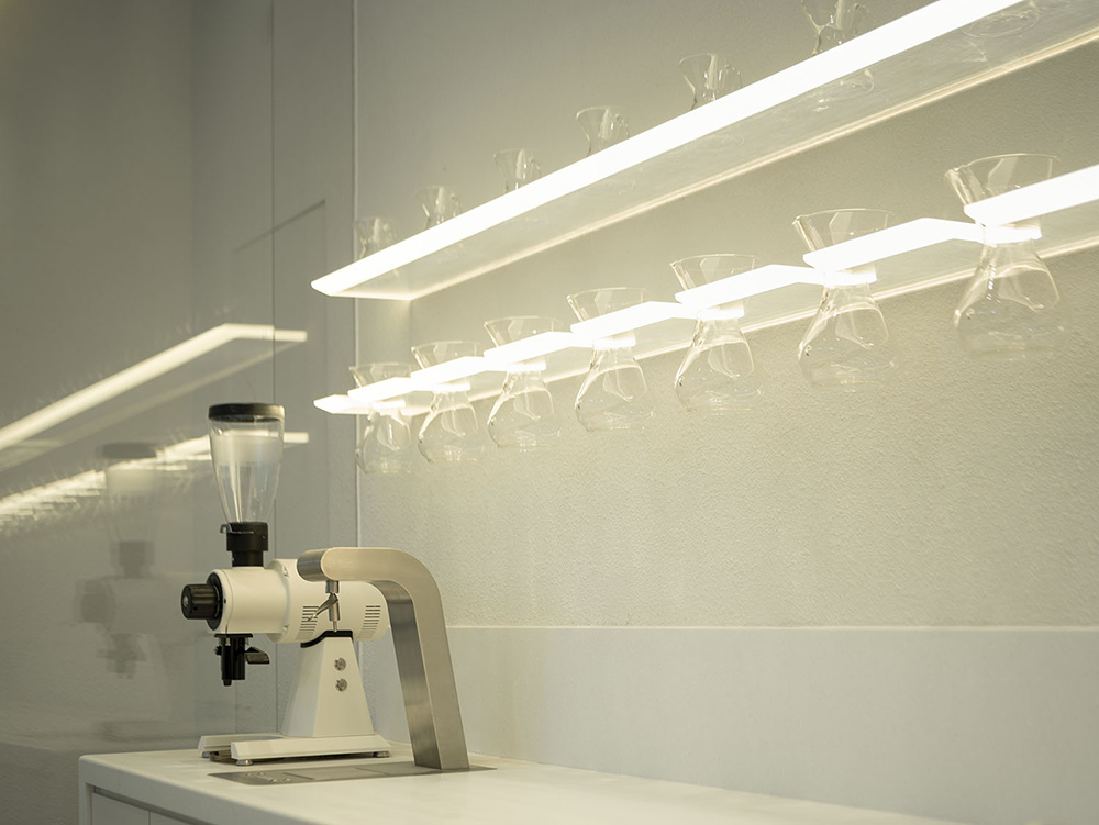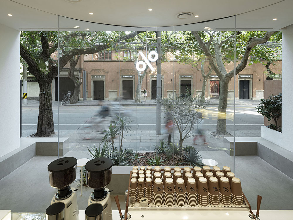 The overall transparent, open and welcoming design helps the coffee shop blend into the urban context and the streetscape. Meanwhile, the design introduces street and urban scenery into the store: The parasol trees, marvelous changes of light and shadows, the crowd passing by – all become a significant part of the whole store. Through the vibrant dialogue with nature and urban streets, we redefine the boundaries between interior and exterior.