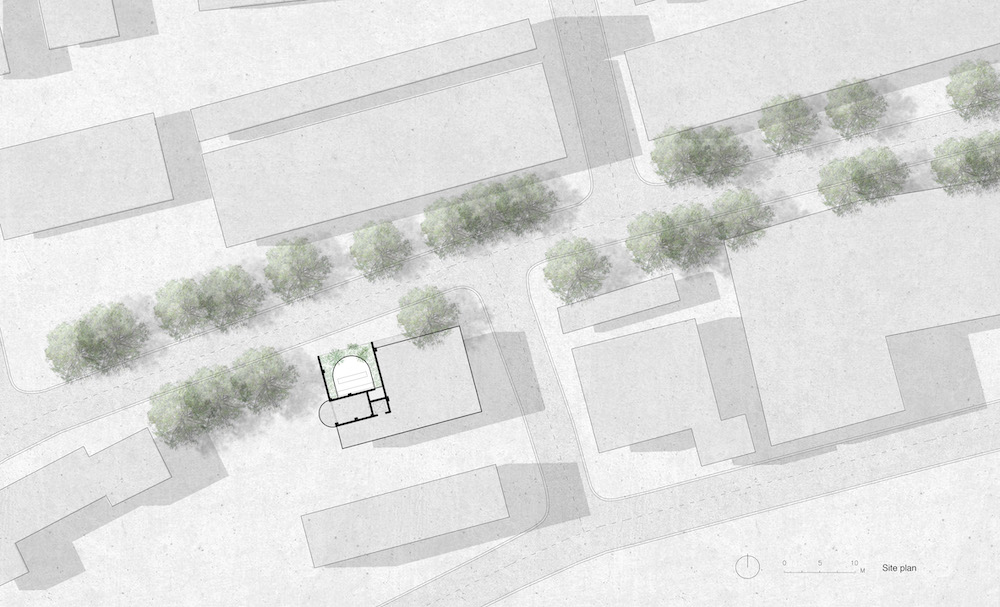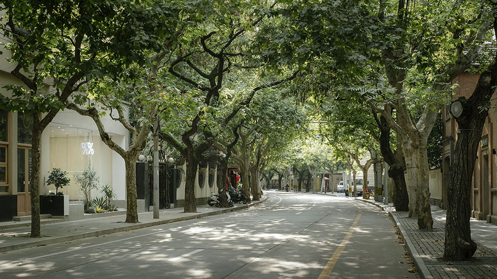 1. 项目场地位于上海市徐汇区建国西路。建国西路全长2498米,宽十余米,道旁梧桐掩映,几经历史变迁。让建国西路成为上海最富有情调的街区之一的原因,不止是两旁历史悠久的建筑,更因为宜人的街道尺度造就了舒适的步行体验。不同于普通商业街道用封闭的幕墙把室内私人空间与室外公共空间完全分隔开的沉闷布局,建国西路相对生动、开放的形态,让街道成为人与人发生交流的场所,形成有“厚度”的城市界面。