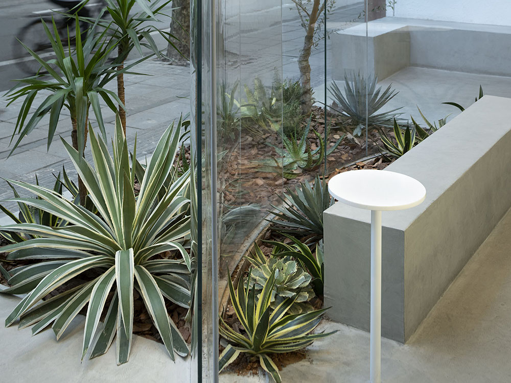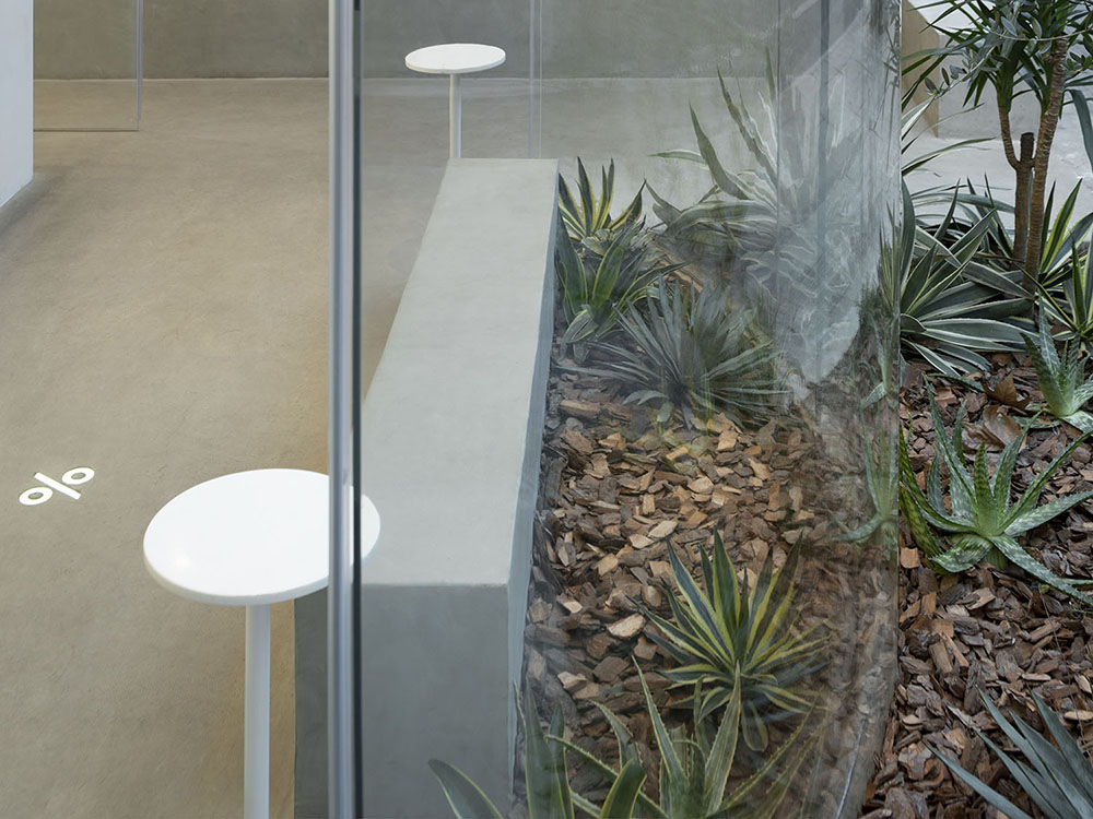 3; The design content of the 50-sqm shop includes both façade and interior renovation. For the façade, rather than practicing with a conventional method, our design chooses to leave the space completely open by creating a small courtyard around a U-shaped glass box. The beautifully curved glass door that can be fully opened and the floor texture extending from the exterior work together to merge the indoor and outdoor space into a whole to the greatest extent, and to leave the inner and outer space blurred. Although the interior space is small, it establishes a courtyard so that the trees in the shop and Chinese parasol trees along the street manage to respond to each other, which can be read as an extension of natural elements of the streets. In addition, in order to ensure the shop’s practicability in different seasons, air conditioning system is installed at the outdoor lounge area. Combined with air curtain machine at the entrance, the system controls the indoor and outdoor air exchange to a certain extent, so that guests can get relatively more pleasant experience in both winter and summer.