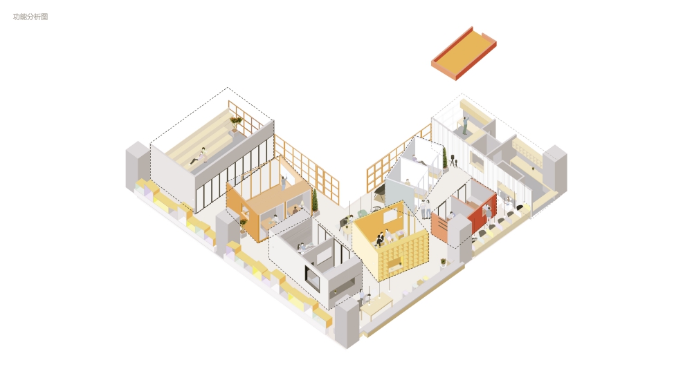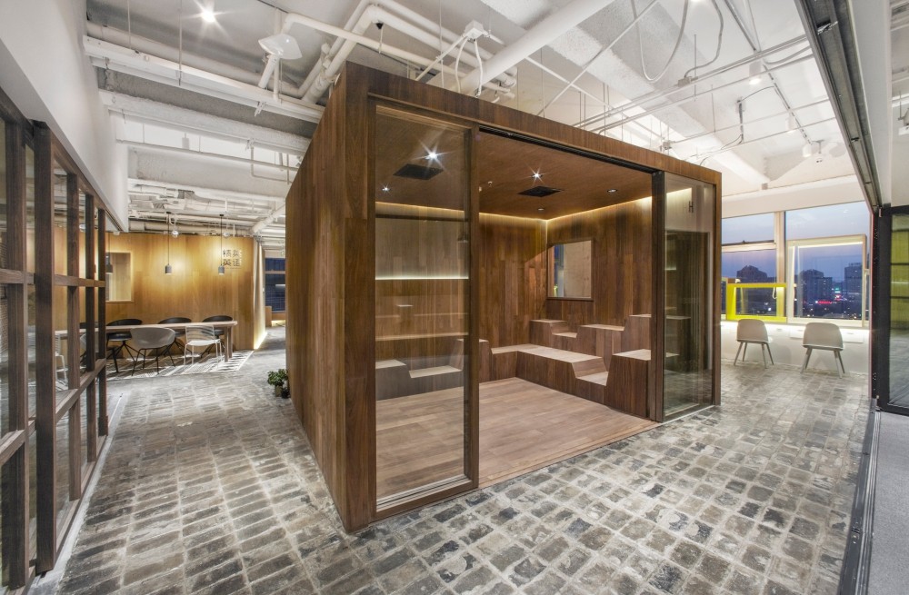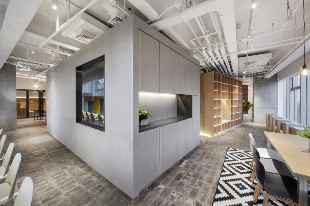 In this case, the design idea of the space is different from the traditional training classroom. The key concept of it are to build a community, it consists of five different materials boxes, surrounded by different functional areas of space, such as study area, kitchen, office communication and other common space. The five room of inside view is the classroom with a good vision and light.