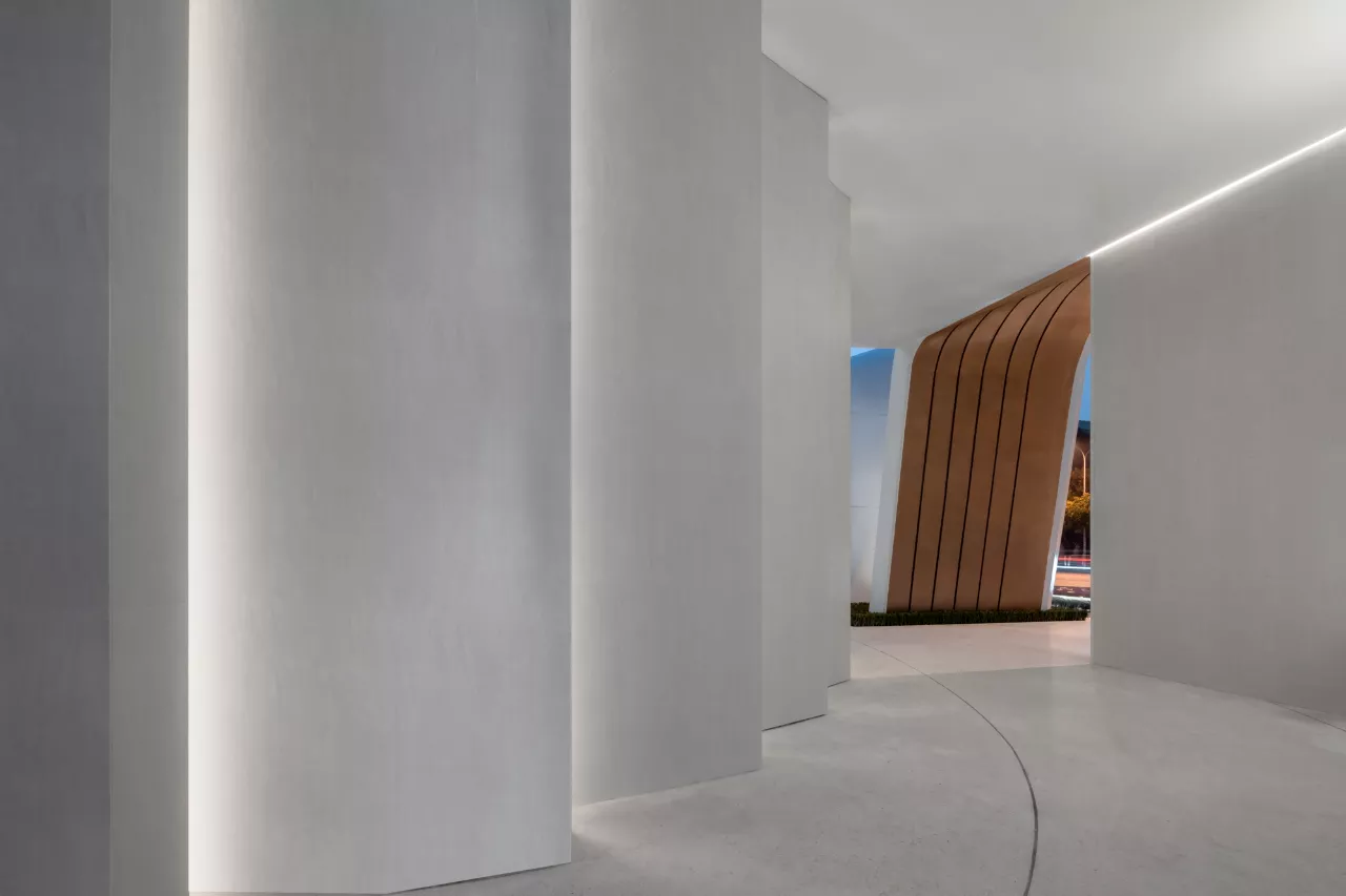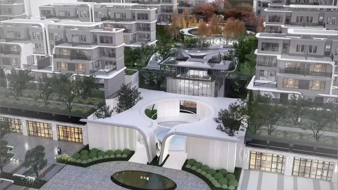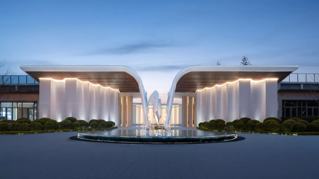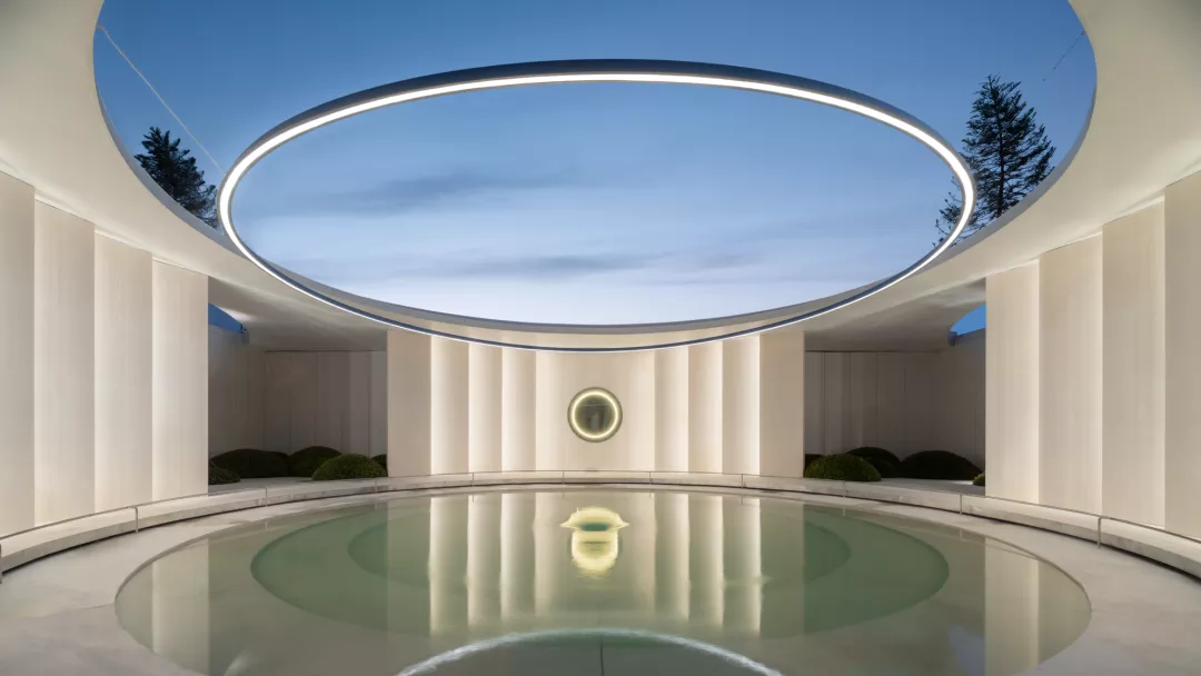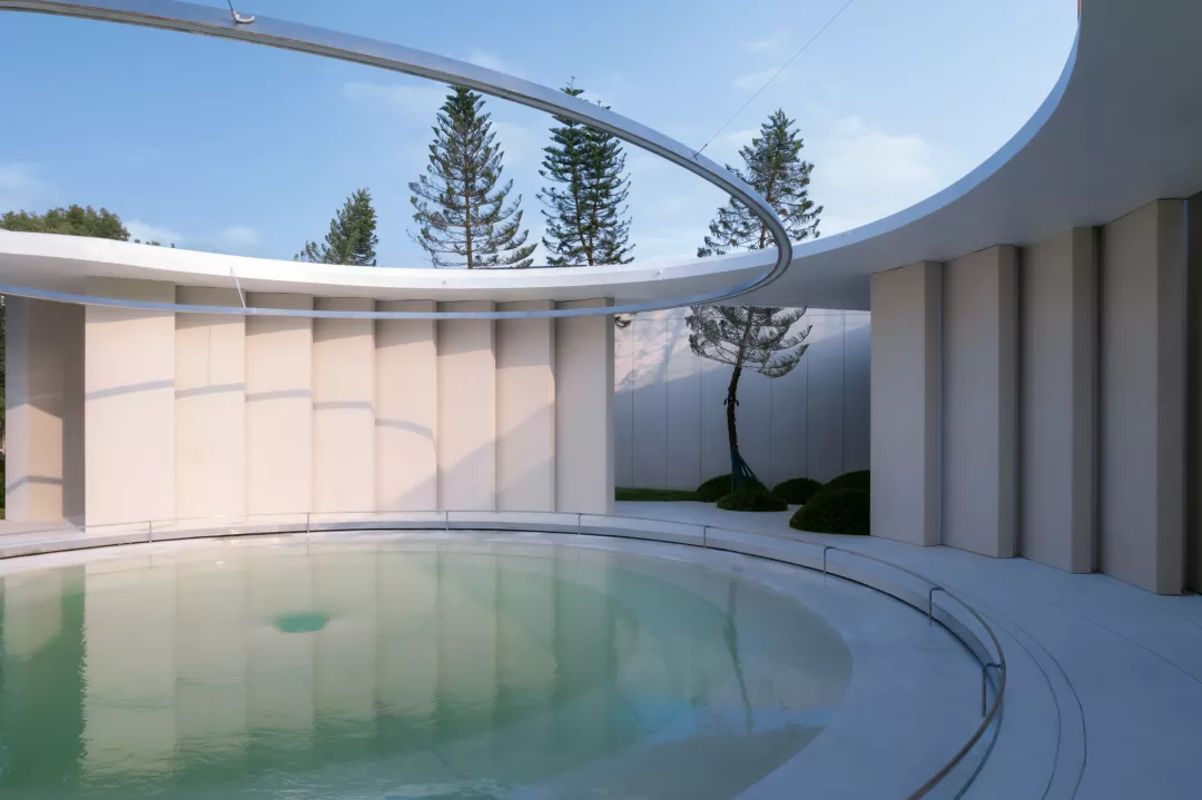 基于此,在由建筑设计师完成的入口“白鹭飞翔”曲线造型的门头基础上,我们以一座中心为水景的纯白色空心圆构筑物的庭院作为开端,将自然的色彩引入其中。