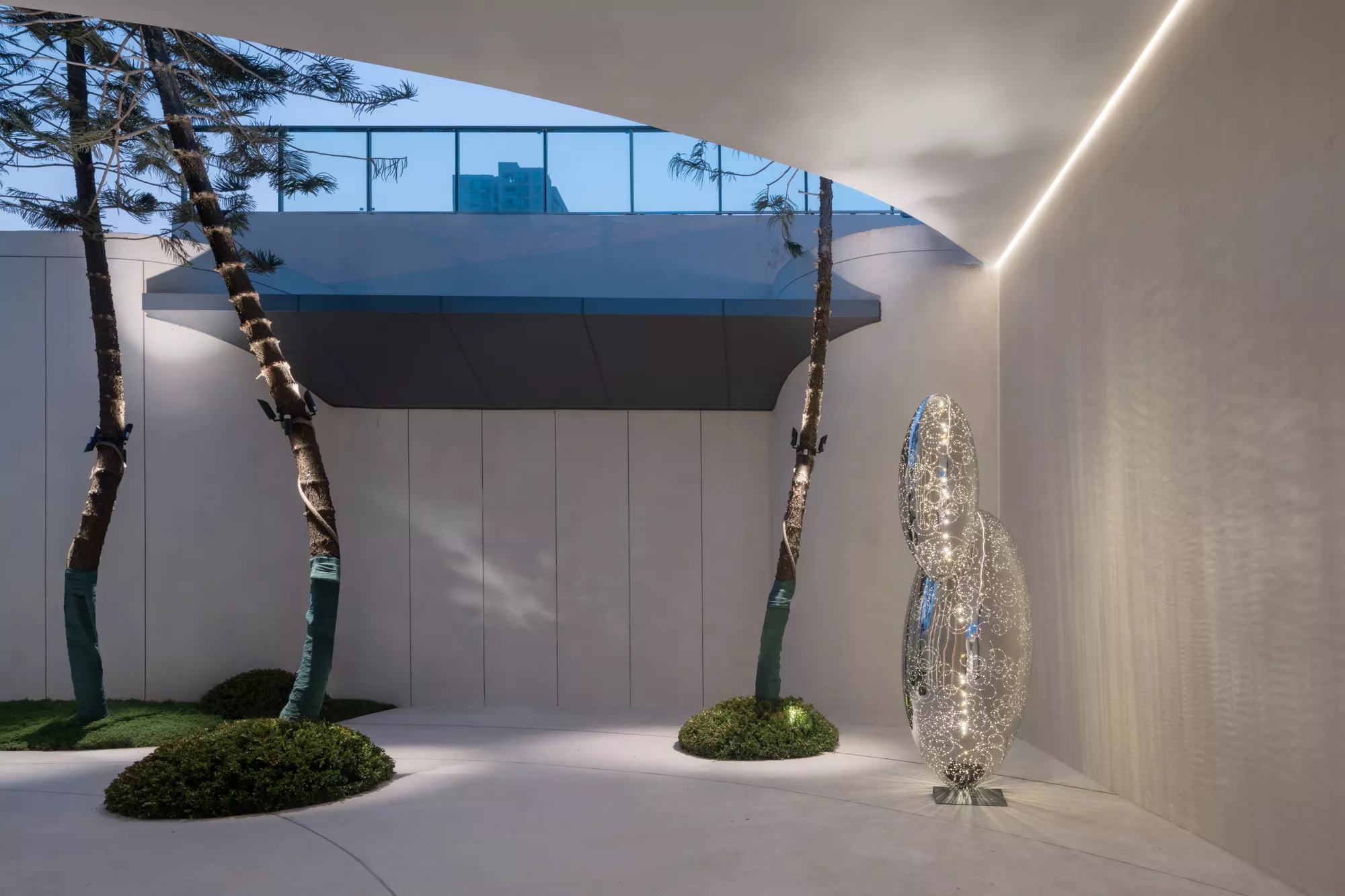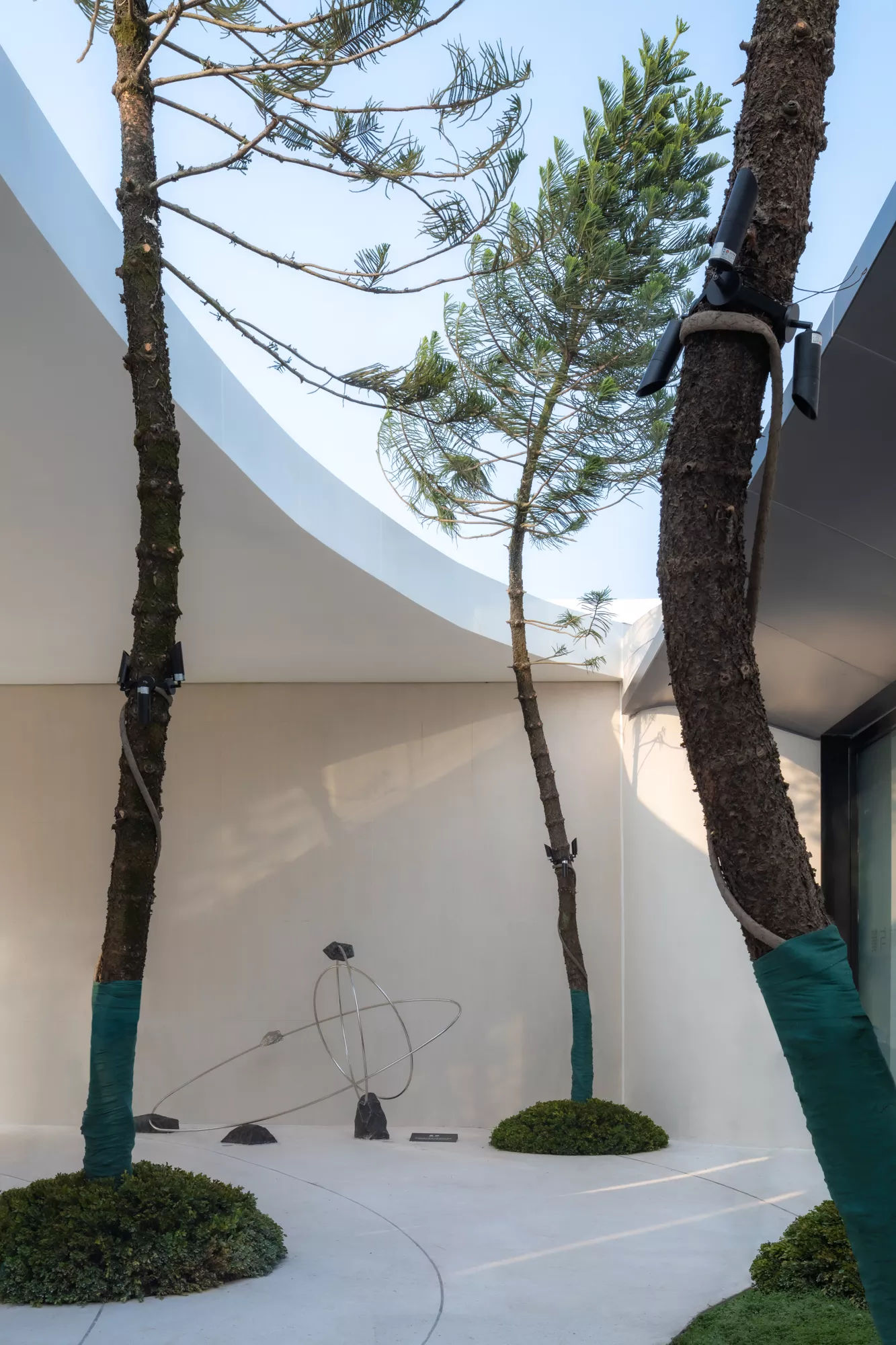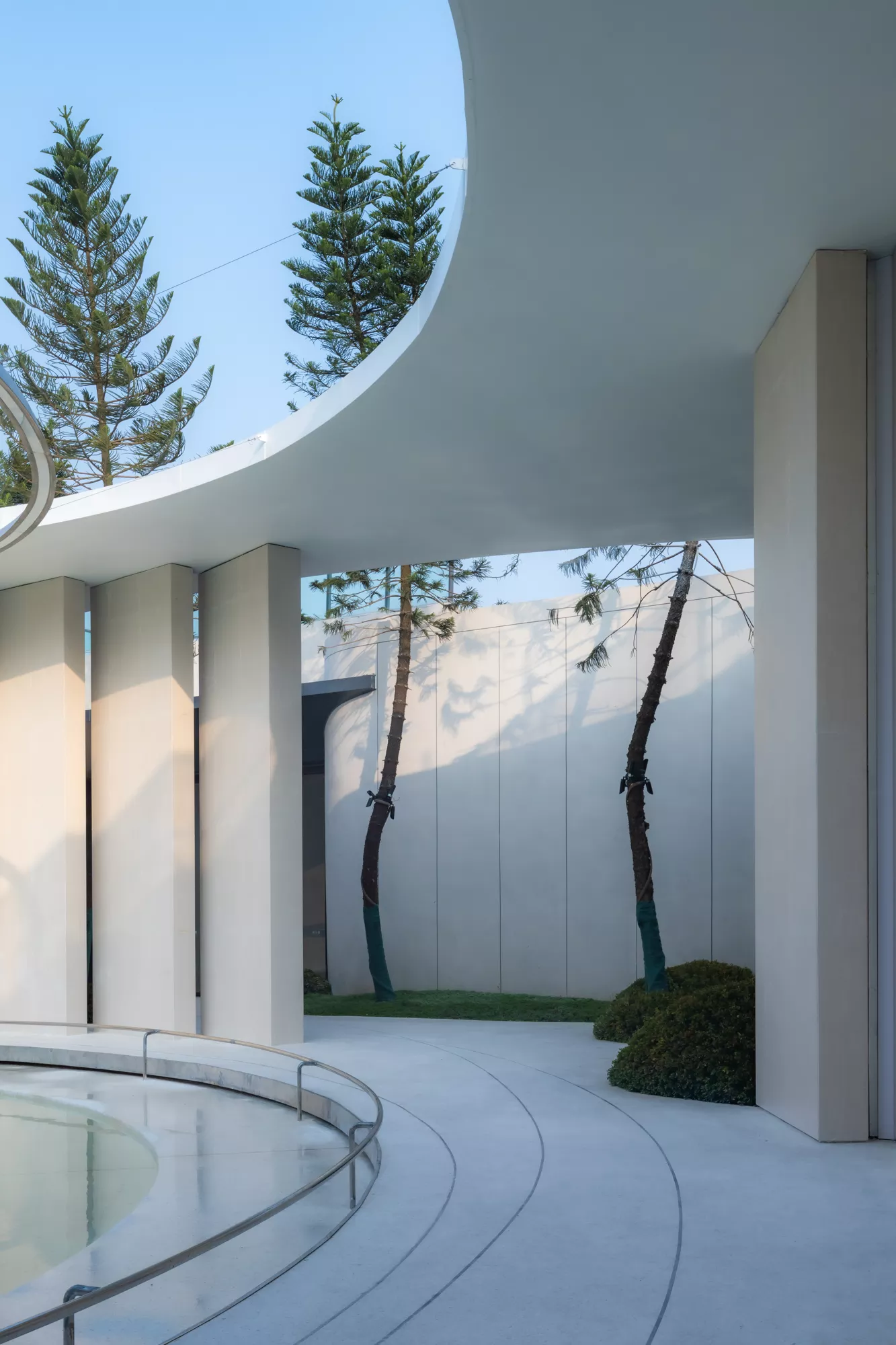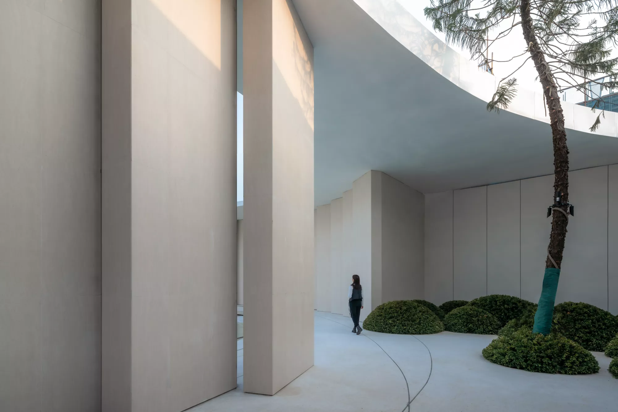 白色的墙面纯净无暇,仿佛能够装得下任何色彩,在阳光照射下,会在一天的不同时间段呈现流动的光影。左右两侧人行动线上,针叶状的南洋杉“穿过穹顶而出“,彰显着傲人的生命力。当我们从圆环底部抬头看的时候,南洋杉的绿与蓝色的天空,纯白的构筑物,流动的光影,在不同角度都洋溢出自然纯净之美。