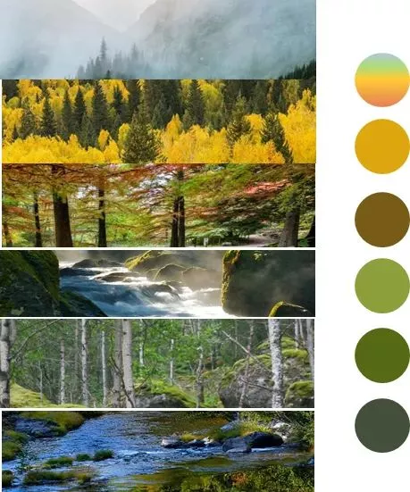 在一个逐级向上的空间序列中,我们希望景观层次也是连贯而有序的。山中森林的自然色彩流动给予了我们最初的设计灵感。如果把大自然的山体视为一幅立体画作,可以看到它的构成是连续而丰富的,随着海拔上升,植被种类、山林色泽都在不断蜕变。潭之深绿,林之博翠,苔之幽绿,树之姜红,叶之金黄,云之浅白。