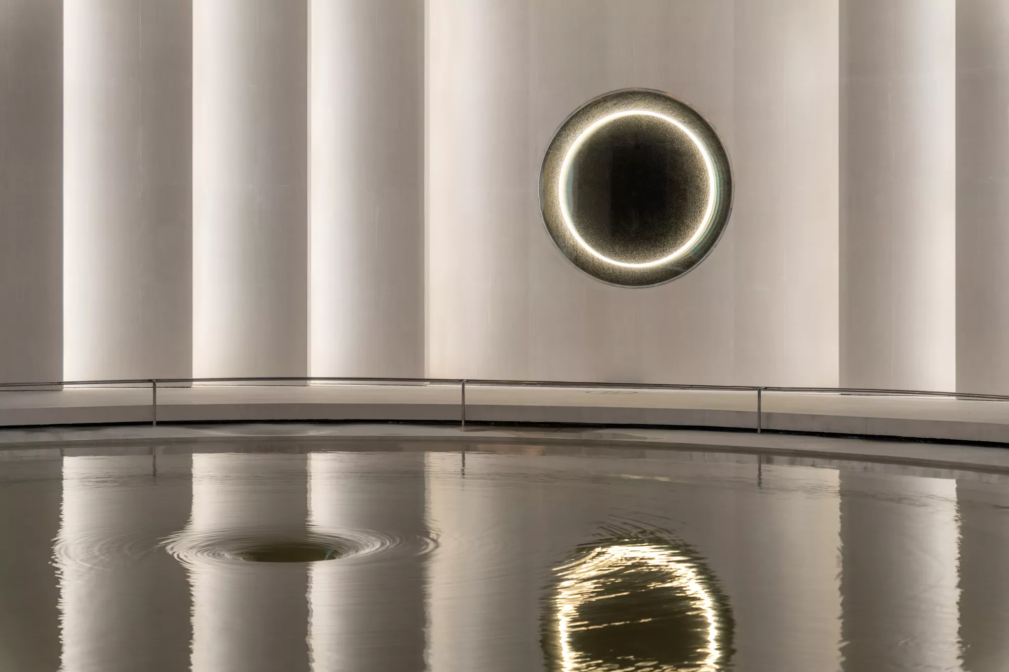夜晚繁星闪烁,倒影在中心水面之上。我们借此展开,将“星辰”的概念做延伸。首先是水景上空的环状镜面灯环,它像是一条星河,反射和延续着空间,给人无穷想象。看似平静的水面实则“暗流涌动”。水流从外向内,流速逐渐变大,水面像泼墨般漫开,如“平静的漩涡”。