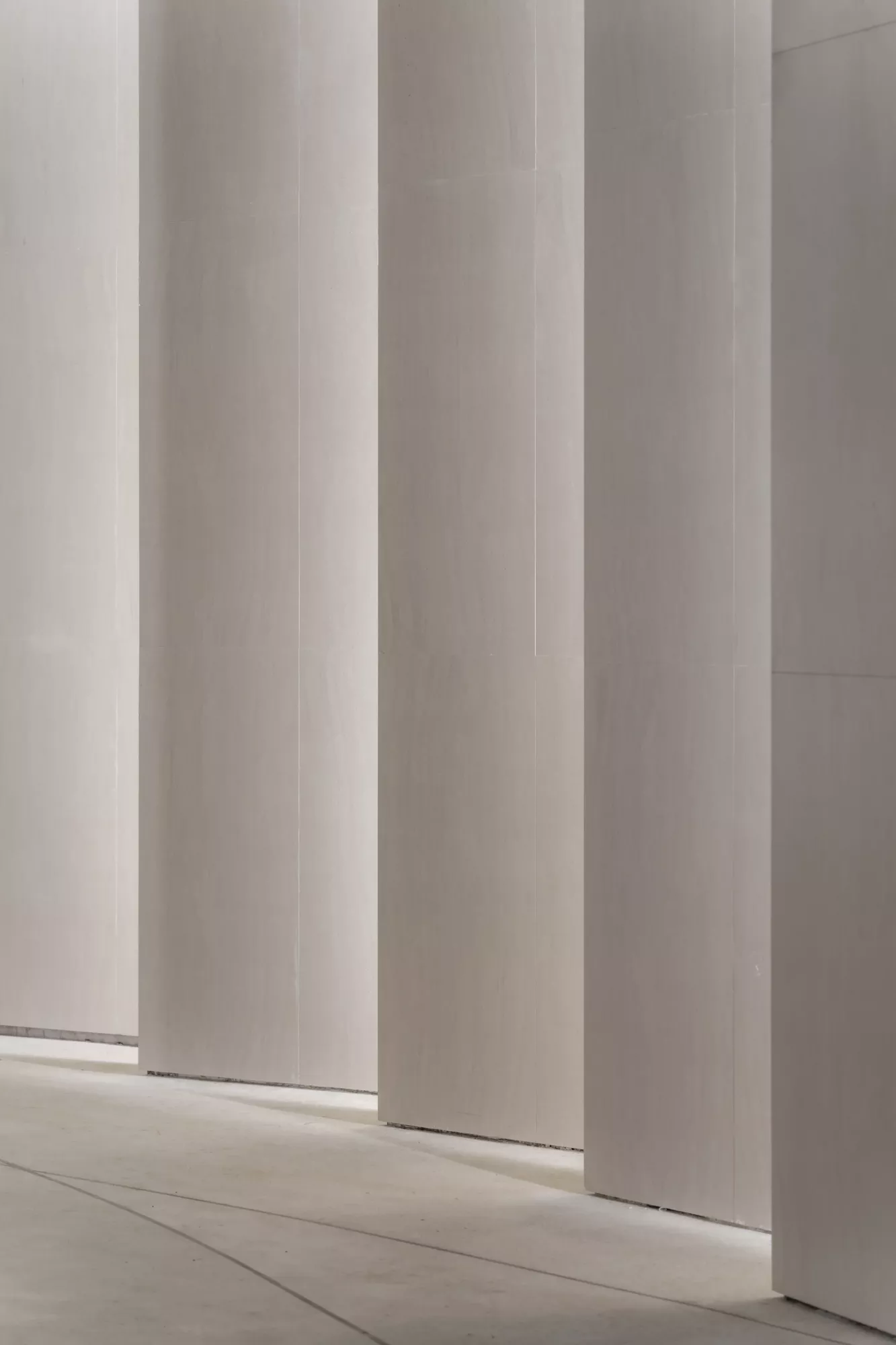 步入圆弧状庭院空间,即真正进入了“自然展厅”。顶部镂空的环形区域,让光线投射进来,视觉上也更明亮。圆环采用双流线设计,两条流线之间则是人行动线。最外层的圆弧立面由尺度相同的片墙叠加而成,增加了空间的序列感。