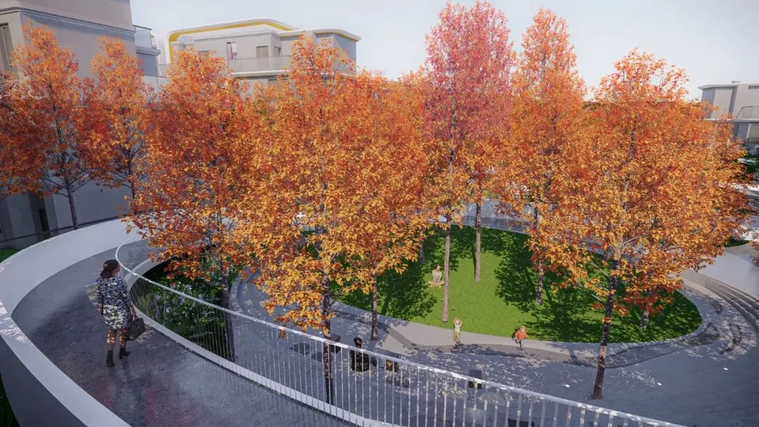 人行步道的处理也暗藏玄机。以行星运动的“星轨”线条,用相交、分离等不规则的复杂形态,为人们的行走增添趣味。我们还挑选了“星系”主题装置——“星云”形状的雕塑、体现星系运转的艺术装置,让场地更具时空梦幻。