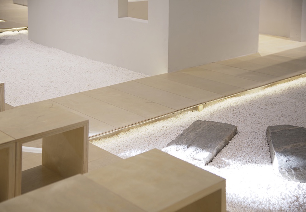 同时,我们用白色的沙子填满空旷的土地,就像日本的干燥景观一样,旨在营造一种静谧的氛围,让人们可以停留在有限的空间里,享受无限的时间。
