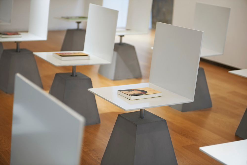 交流和阅读区是本项目的主要服务空间,由三排六行的18把椅子组成。椅子的设计与吊灯的设计相结合。这些椅子在需要时用作阅读和交流的座位。在剩下的时间里,这些椅子是放书的展示桌。椅子是旋转的。这为人们使用它们提供了更多的可能性,这为这个空间提供了巨大的潜力。员工空间和储藏室隐藏在客户视线之外,这保证了整个设计的简单性。东墙分为两部分。一部分用于显示销售图书的信息;另一部分用于收集读者的信息。西部的这堵墙是用来展示演讲信息和用户信息的。