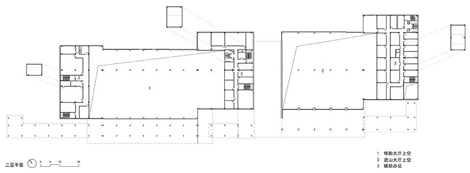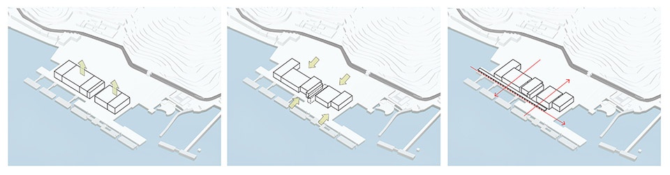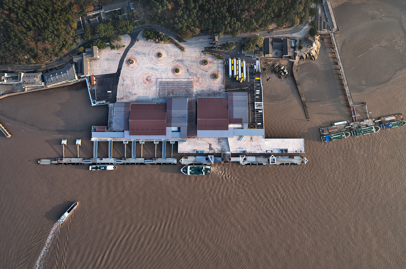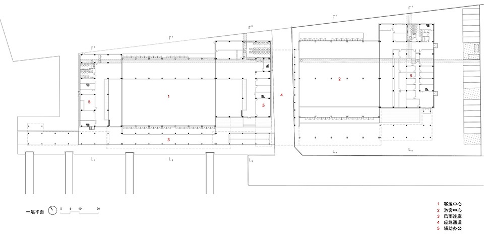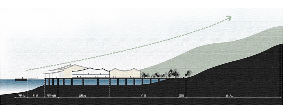 出于对场所特殊历史价值与环境价值的考虑,设计保留原基地东进西出的主体格局,延续码头的运作方式与习惯。向海上扩展搭建平台作为新客运站的基础,将原客运站场地规划为新的站前广场,扩大室内外空间的同时还解决了新客运站建设期间码头正常运行的问题。