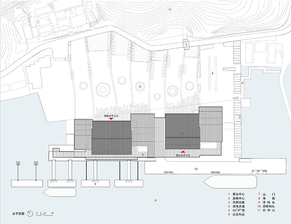 普陀山正山门客运中心位于浙江省舟山市普陀山岛,是普陀山风景名胜区唯一的对外公共交通港口。项目集成了码头区域、入山售票、广场集散、出山候船等功能。每年有超过1200万人次由此进出,原有的码头客运站难以承载日益增涨的游客流量。