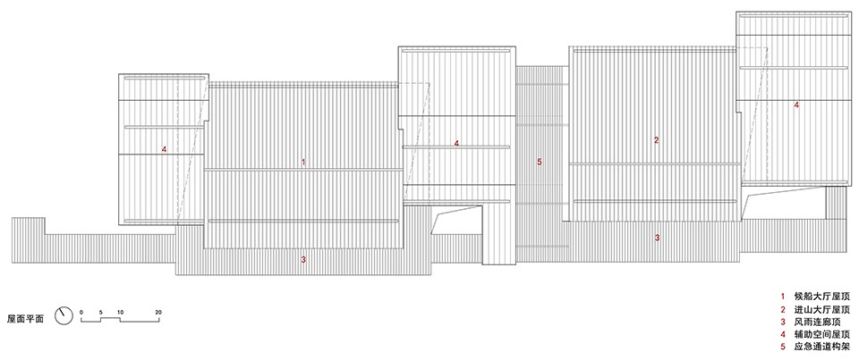 设计打破常规交通建筑大体量与标志性的特点,由南而北,由海面长廊到重檐缓缓上升的坡顶直至北侧的远山,建立一个舒缓的视觉体系。由东而西,建筑化整为零,将进山大厅、出山大厅和其他辅助空间错动排列,两翼后退,观景视线尽少被遮挡。建筑由此变得轻松而谦虚,令码头成为登岛敬佛的通过性空间和虔诚的起点。