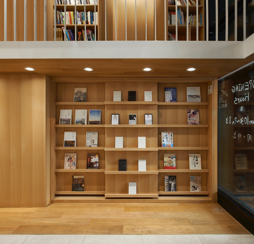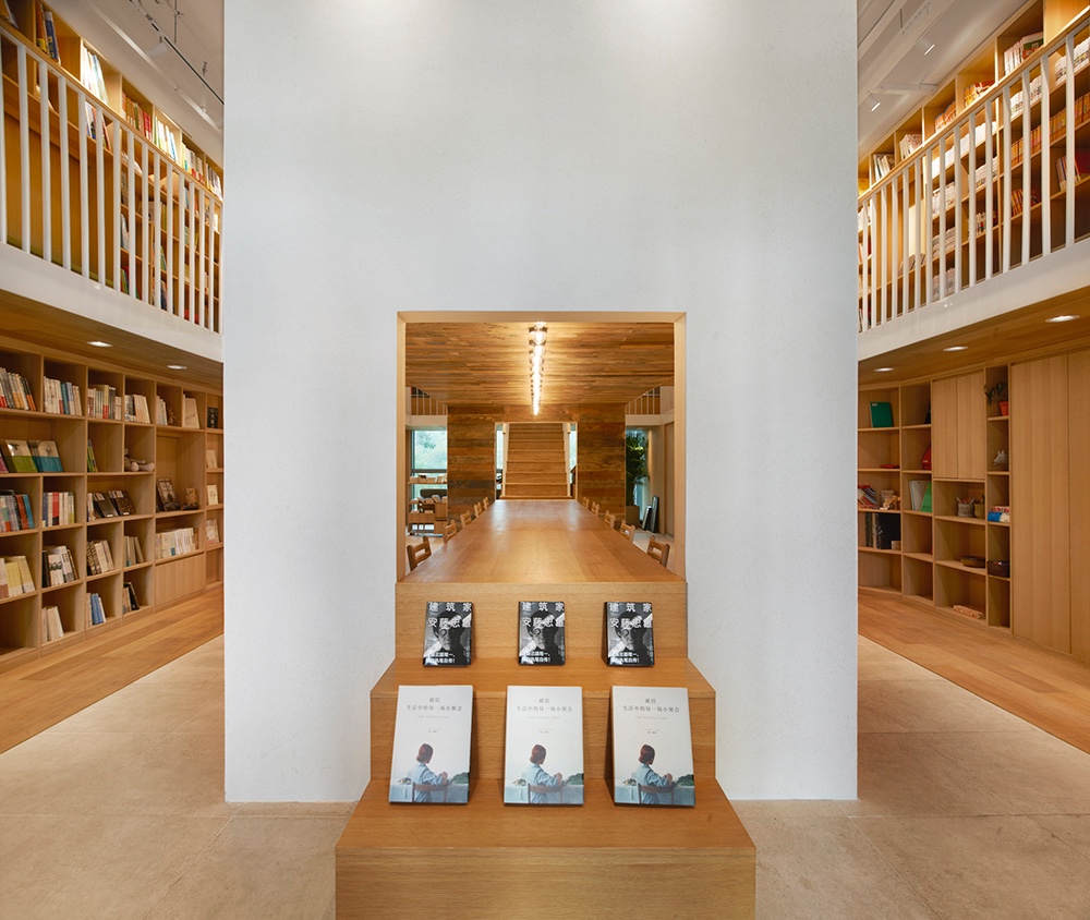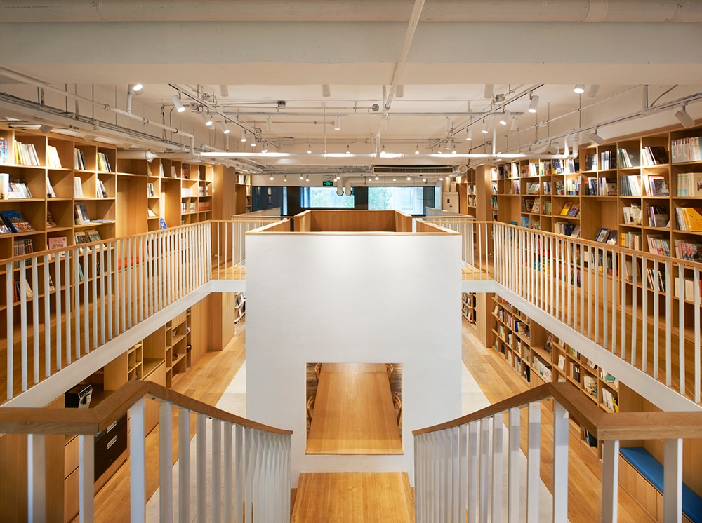 This design has a clear axis. The axis stars from a showcase of best sellers on the second floor, which is near the entrance. It passes through a connected central reading zone formed in a rectangular box and a T shaped stair then ends on the first floor. Bookshelves and tea bars are located on both sides of this axis. Visually, this design of axis gives people a sense of extension.