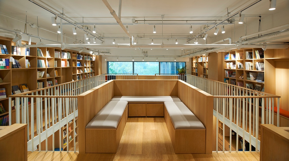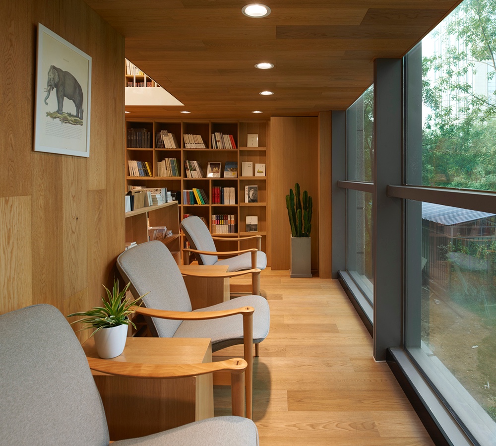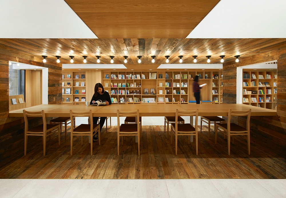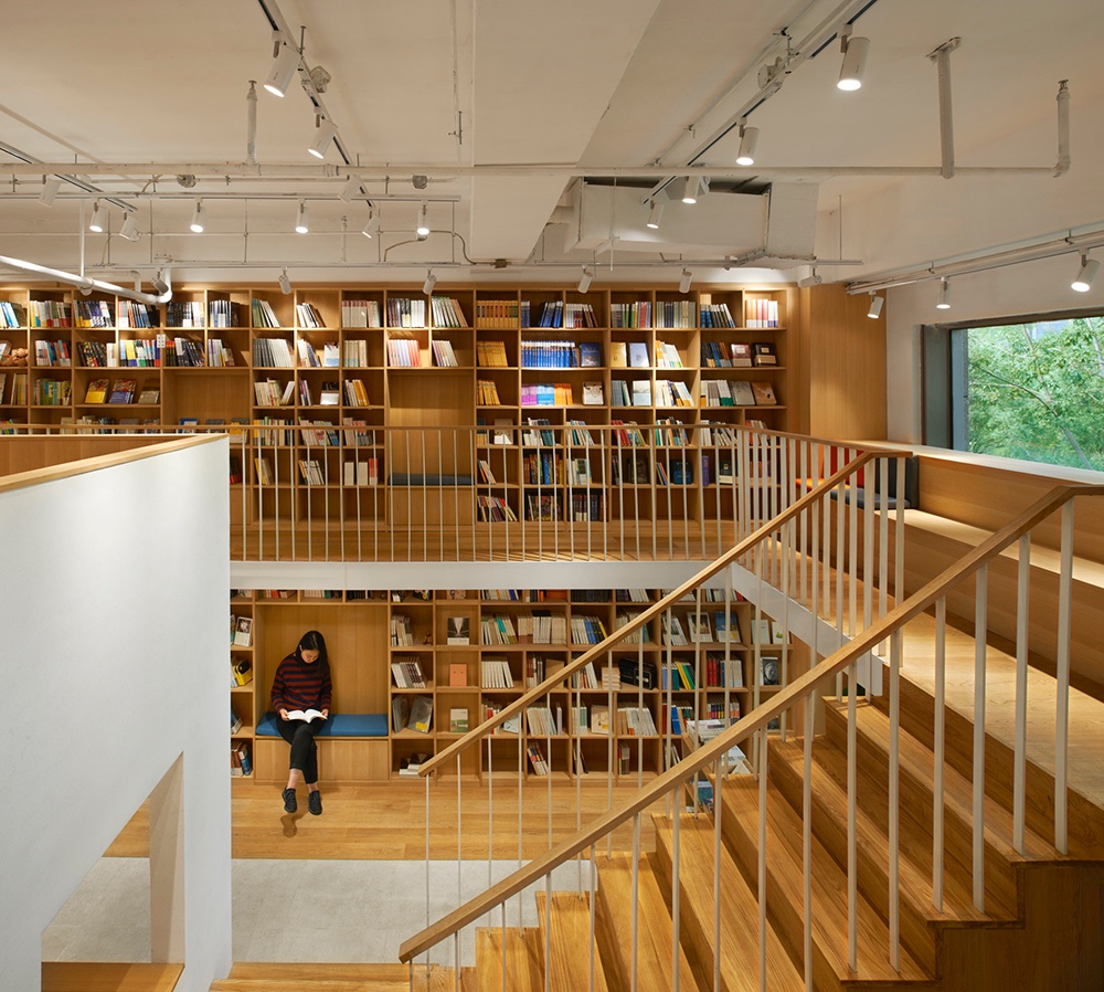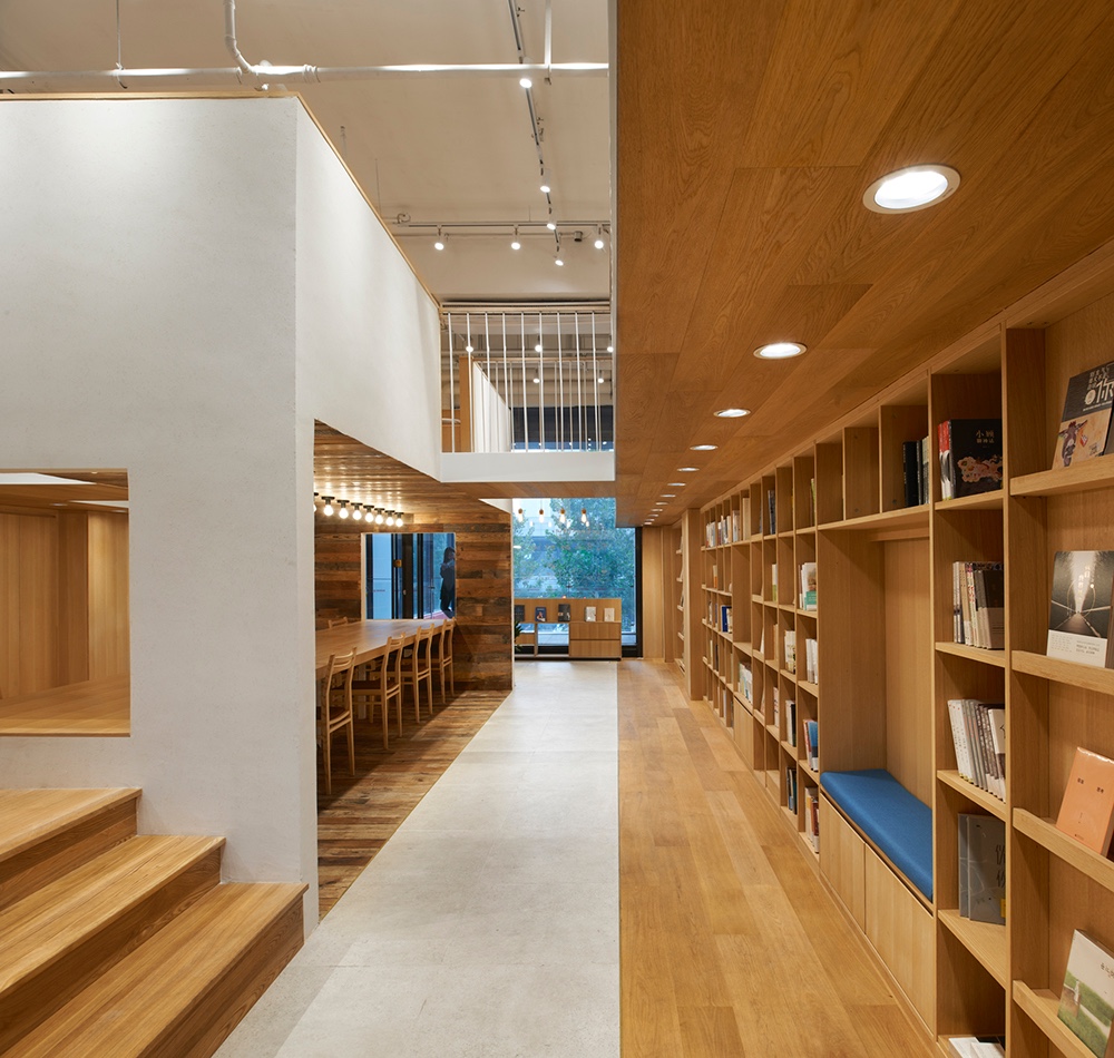 The efficiency of using space is also enhanced by the complexity of functions. For example, the lower level in that central reading box is reading zone while the upper level in that box is a multi-functional area where integrated the function of cashier desk, bars and storage. Some seats are placed near shelves for clients to read and rest.