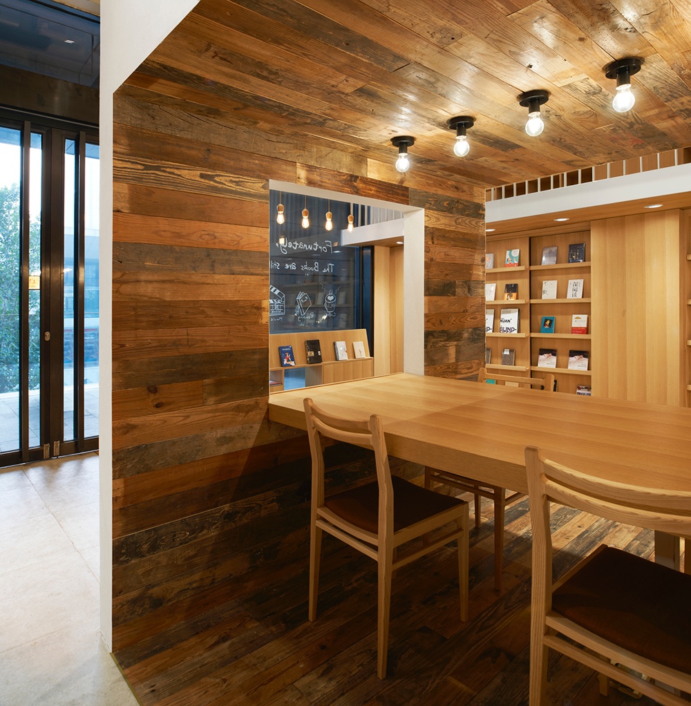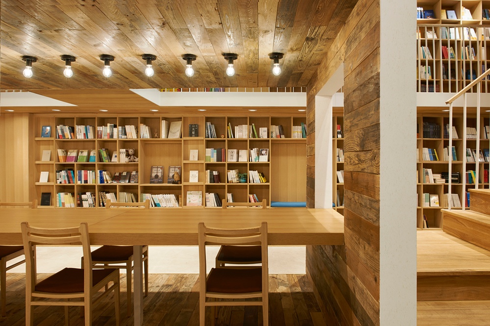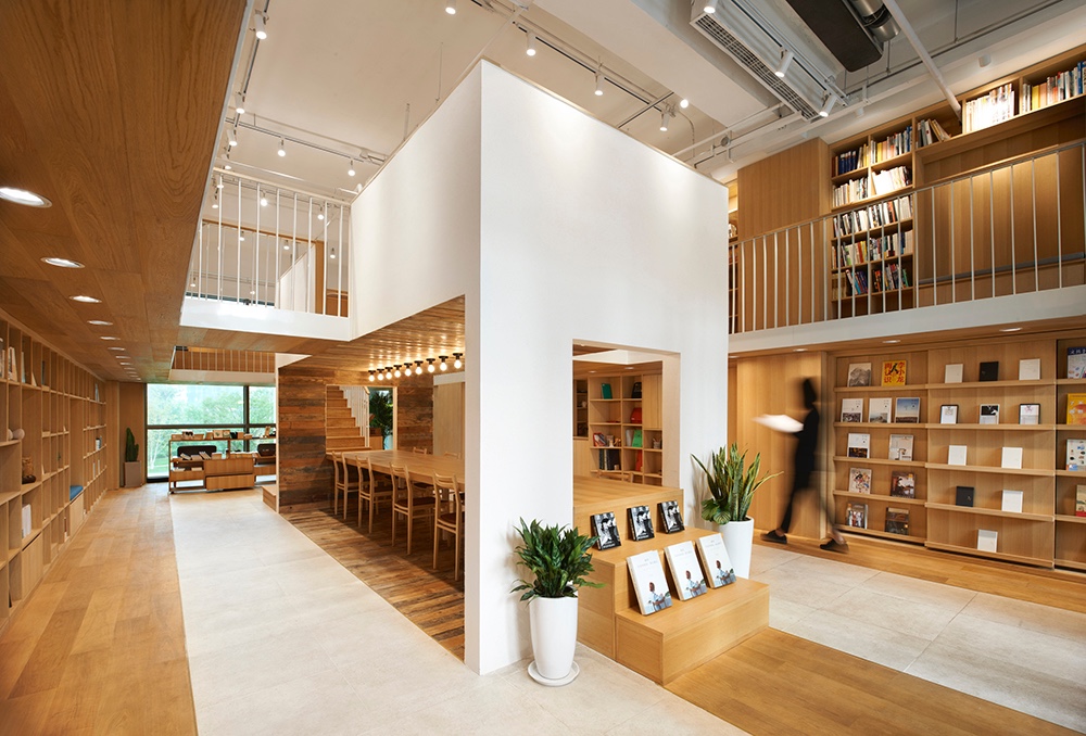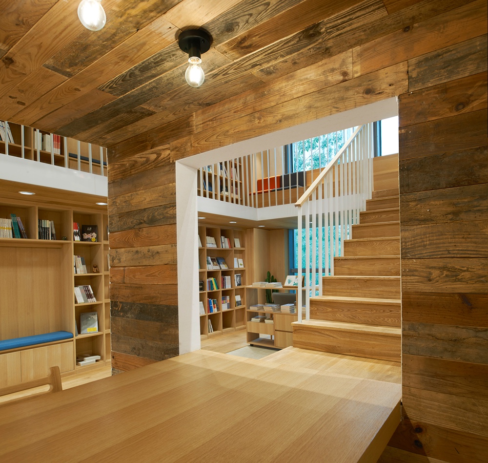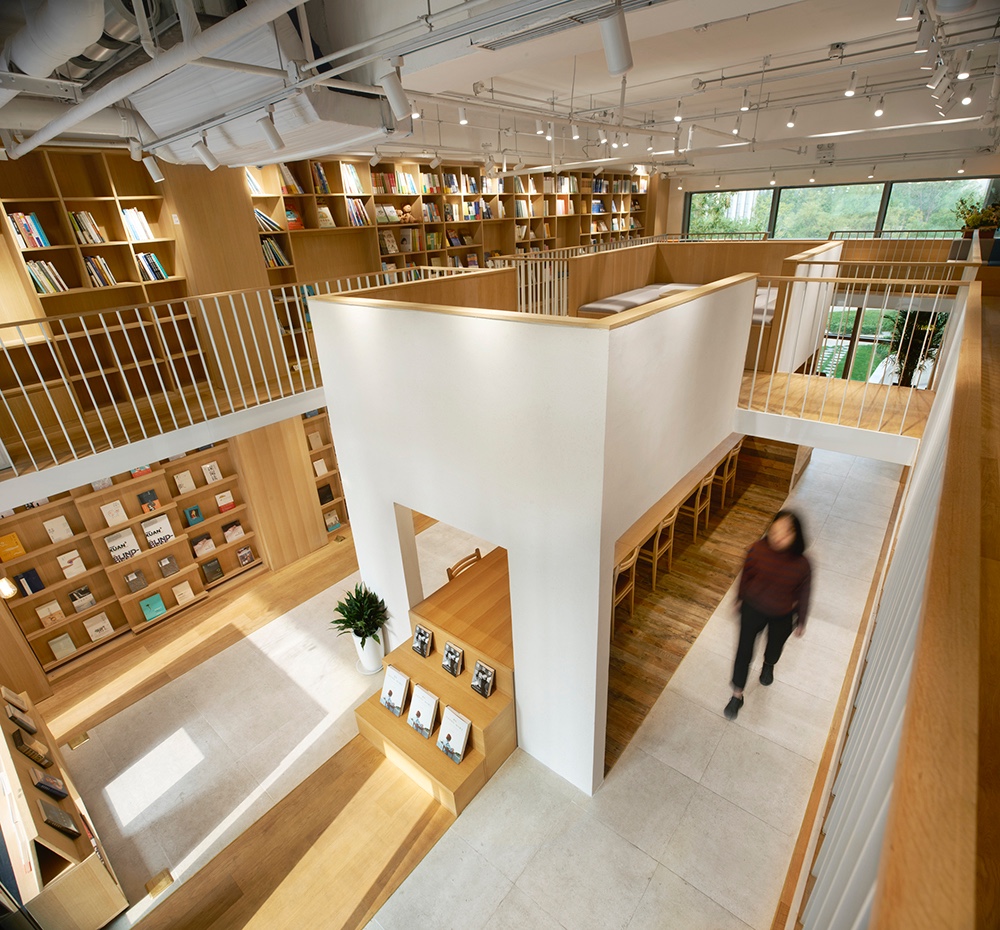 The efficiency of using space is also enhanced by the complexity of functions. For example, the lower level in that central reading box is reading zone while the upper level in that box is a multi-functional area where integrated the function of cashier desk, bars and storage. Some seats are placed near shelves for clients to read and rest.