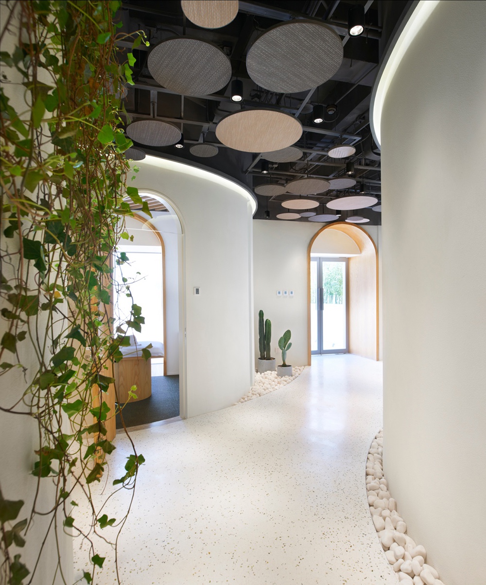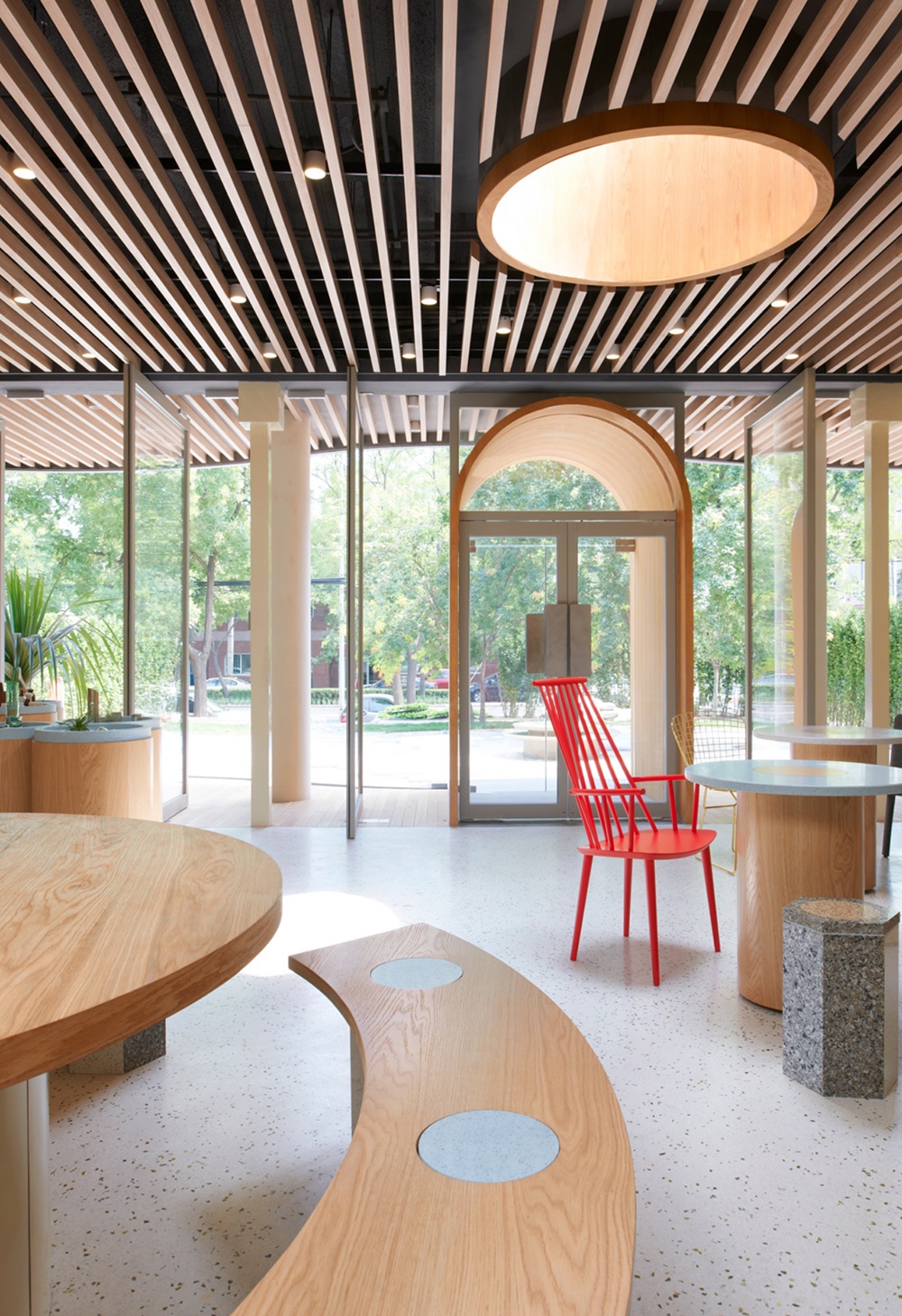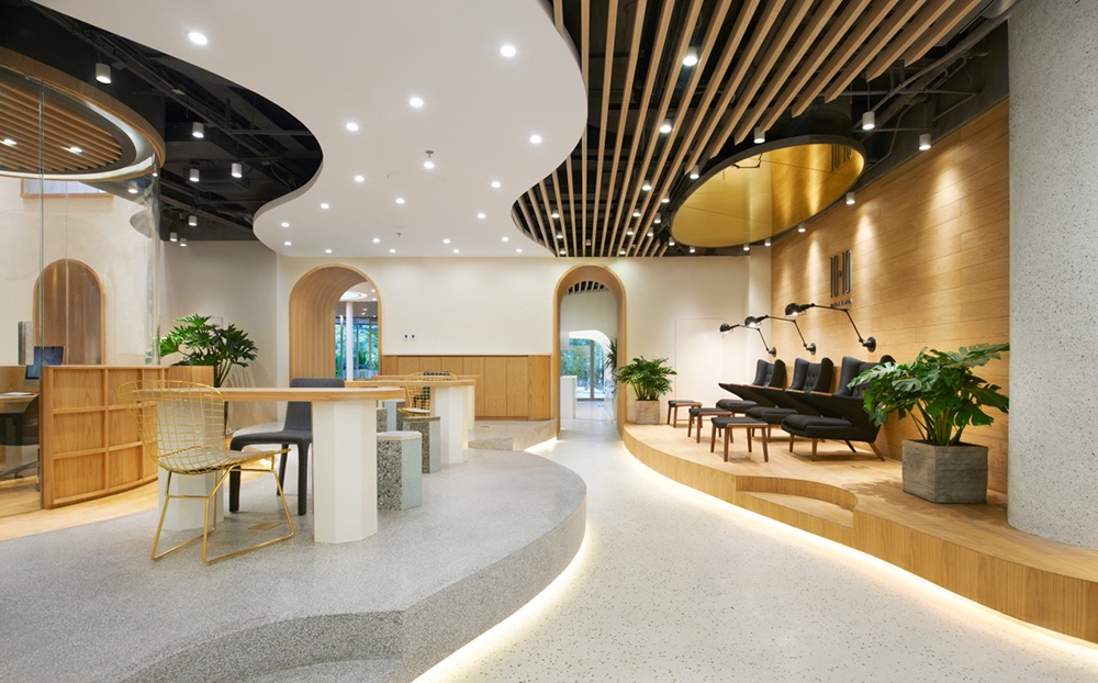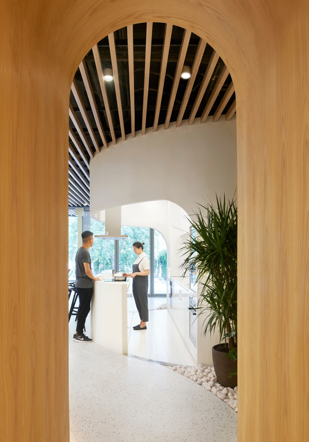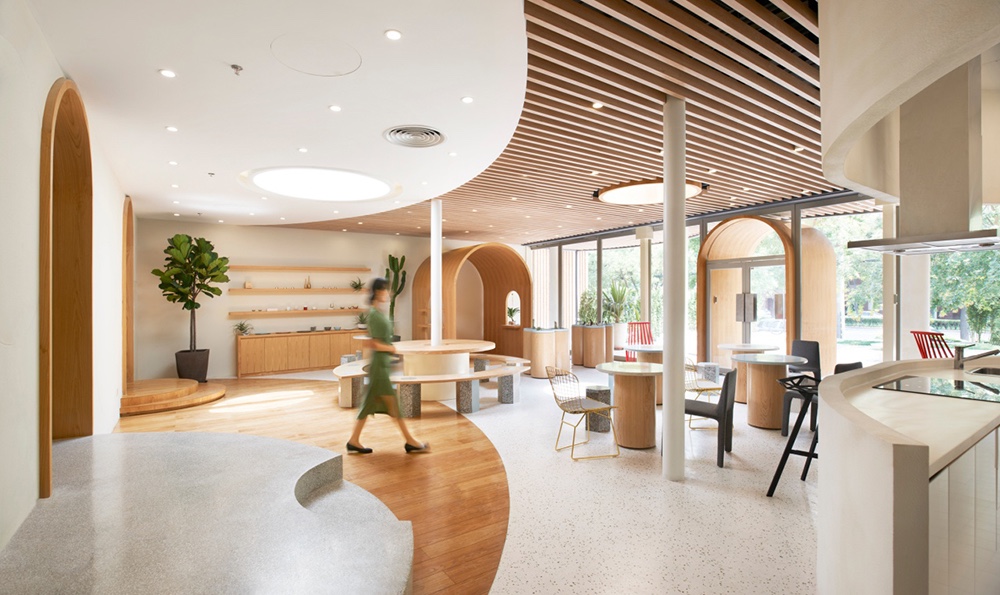 In terms of spatial layout, in order to meet the overall concept of the store, circular elements are more used in the form and layout of the space. While ensuring the specific functional space, it creates an overall continuous open space, which increases the opportunity of communication between people. The fuzzy space definition makes the indoor space like the extension of Hutong street.