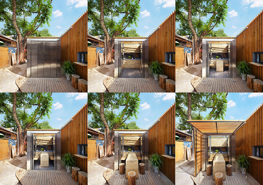小型独立厨房通过可变化拉伸⻓长度桌子来满足2人、4人、8人不同情况下的用餐需求,当8人同时用餐时南向墙面会被完全打开,将桌子拉伸至院子内,同时可将屋顶上方格栅拉伸展开,起到挡雨遮阳的功能。