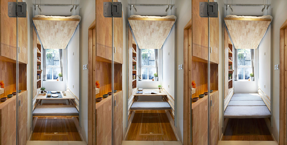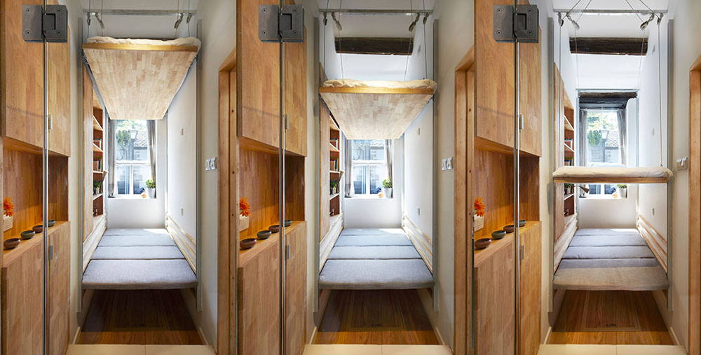 In the bottom part of small bedroom area, we referenced the “haoshe” system of imperial examinations in former times of China – table top and seat could be adjusted to a certain height to serve as bed deck. We designed 5 different heights for wood panels that the room’s func1on could be switchover in teahouse, shop, and bedroom, qualifying the purpose of flexibility in small space. Moreover, in the upper part of bedroom, we take the advantage of contemporary technology-‐ motor lifting bed and stainless steel wire to adapt potential needs and requirements in the future, successfully combined the wisdom in former time and modern technology.