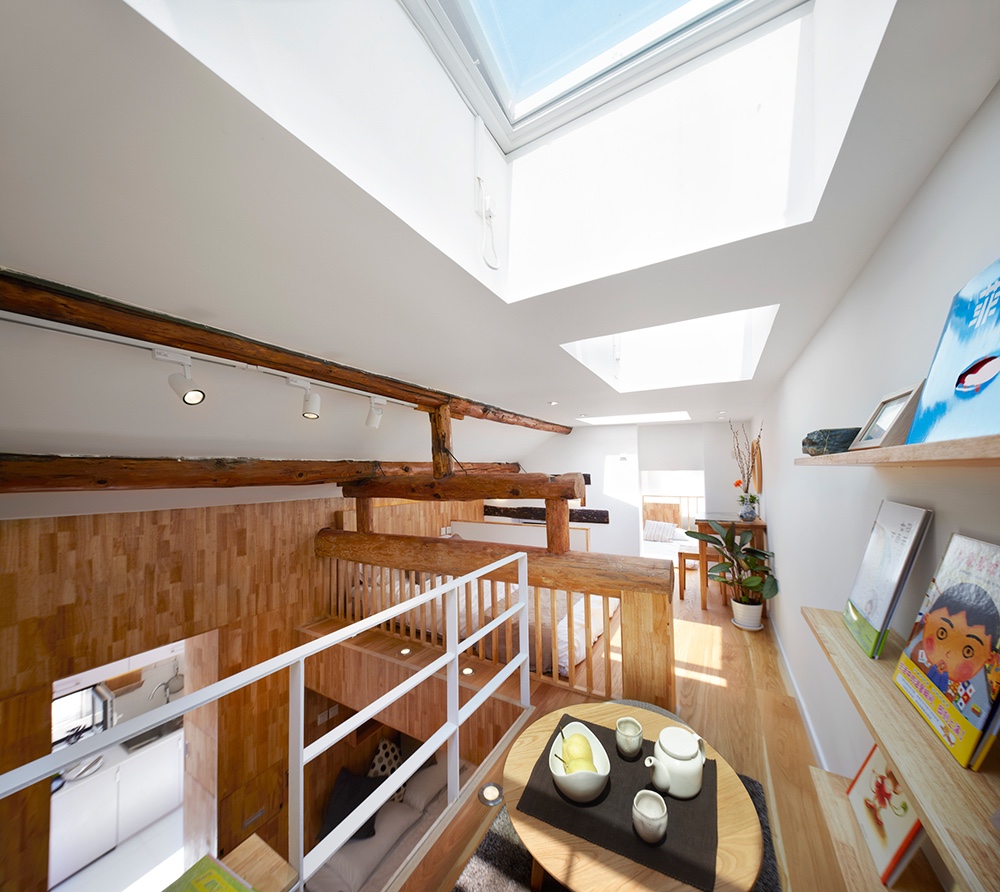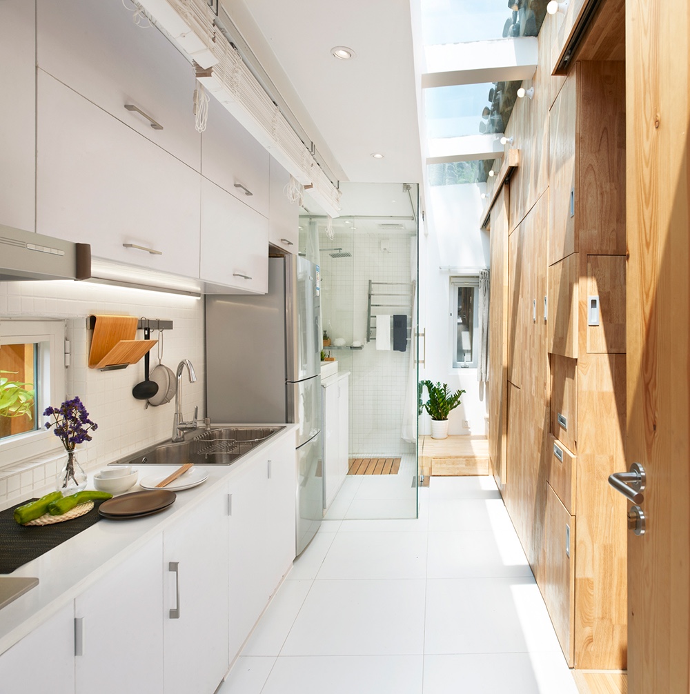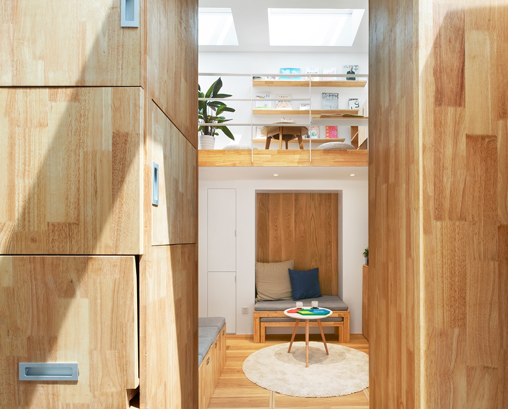 细节设计上,利用天窗解决室内因开窗面积小采光不足的问题,同时也不占用墙面的收纳空间。