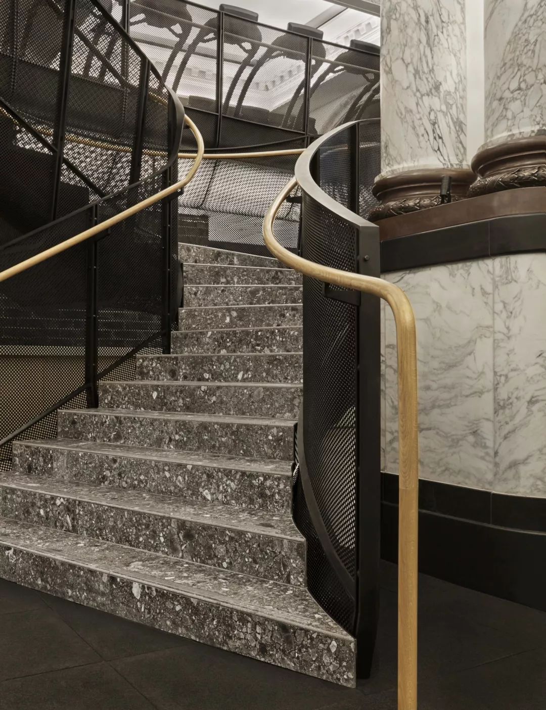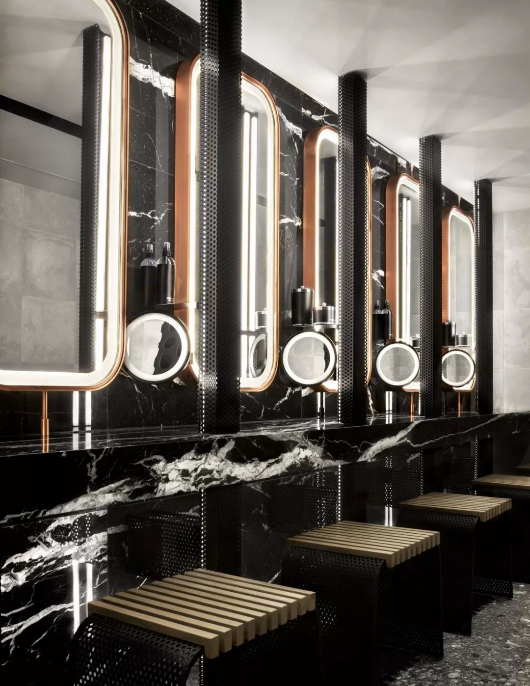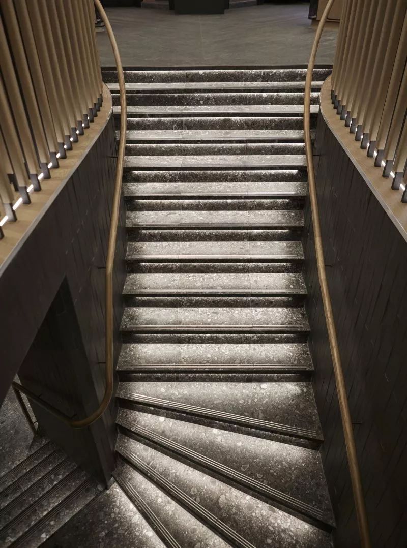 在铺满大理石的内部空间中,主健身场所上方增加了金属夹层。其余空间则贯穿了零售店、休息间以及茶吧。