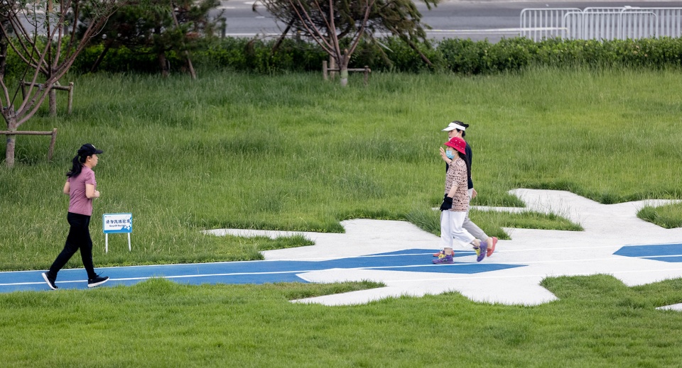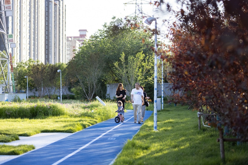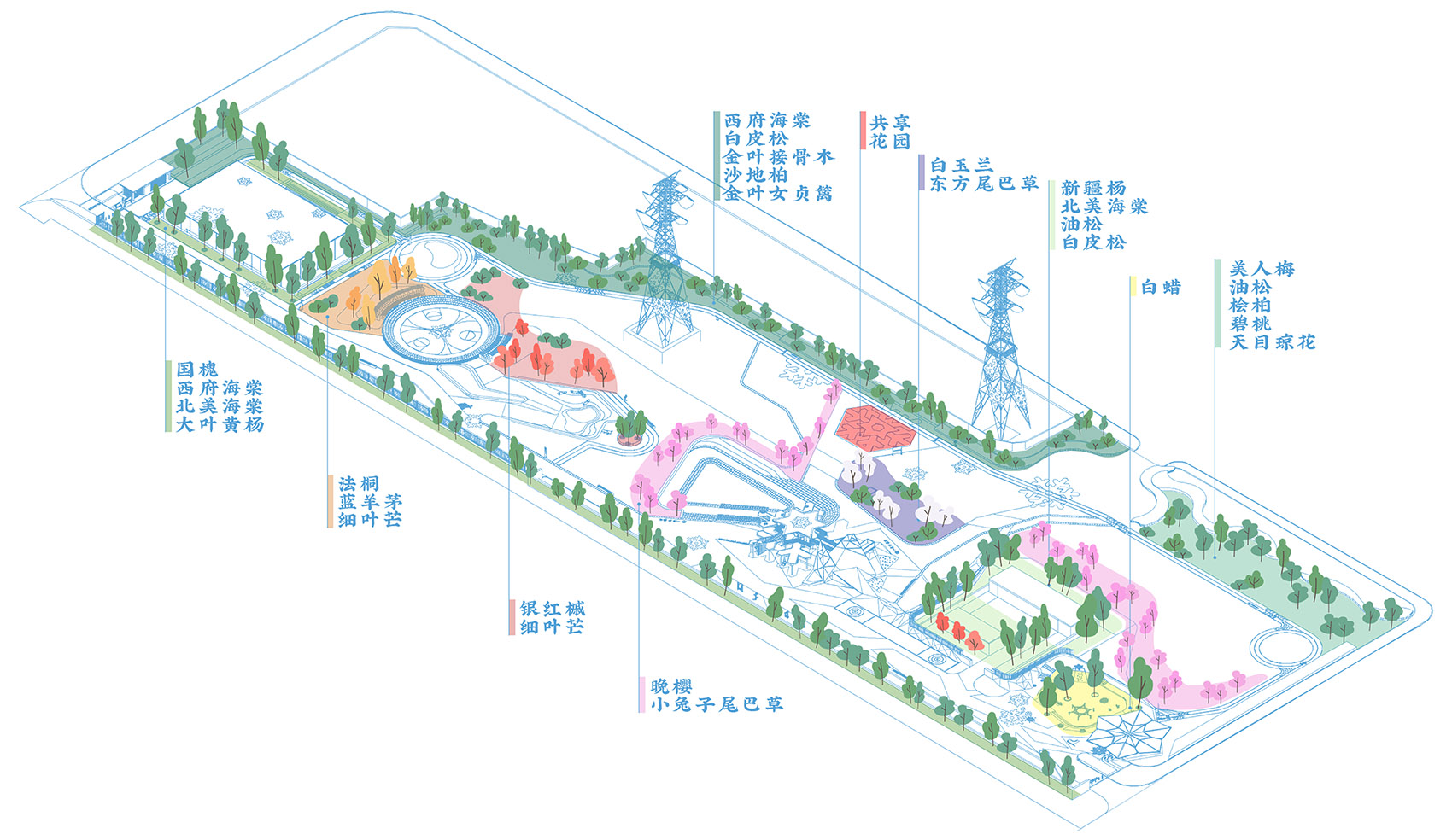 Based on the current situation of the site and comfort test, under the condition of high-voltage corridor, the activity site is suitable to be designed in the sunken space, or with the help of shed, fence, plants to pull away the sight distance from the high-voltage line, providing a more secure psychological security. A 400-meter-long running track is set up around the park to form a complete running loop, and the blue plastic paving is matched with snow patterns on the ground, fully echoing the main theme of the Winter Olympics. The breeze blows, the leaves sway, and people wander in the infinite greenery, free and relaxed.