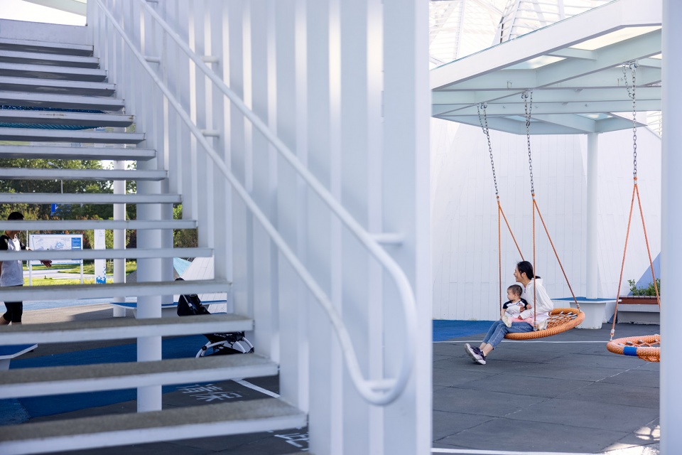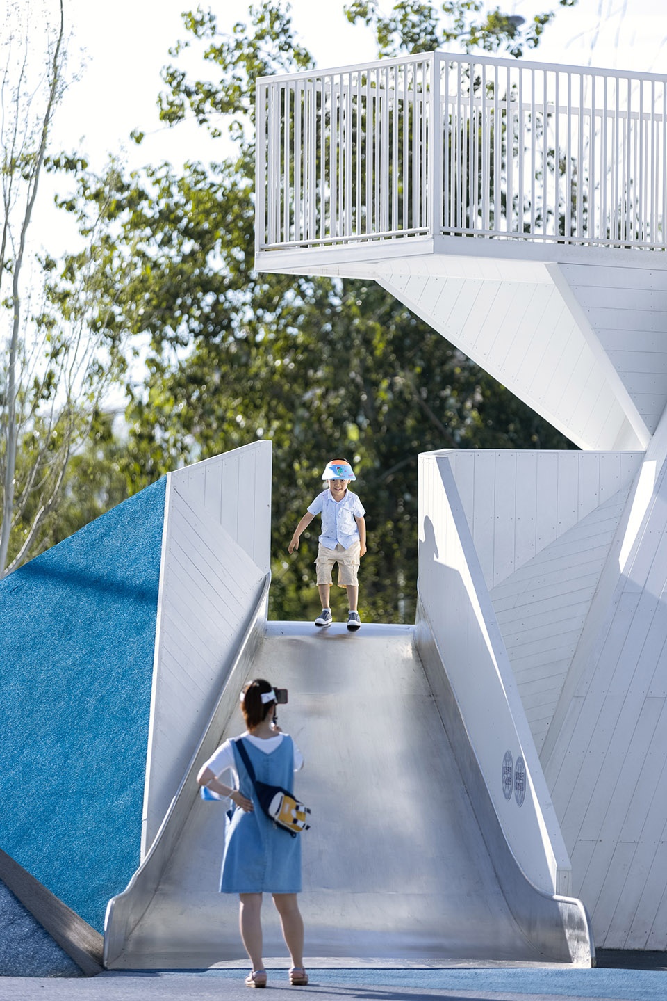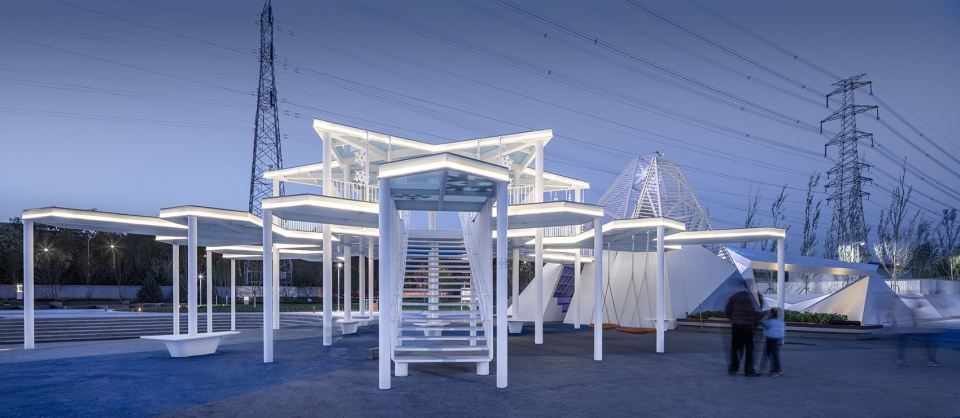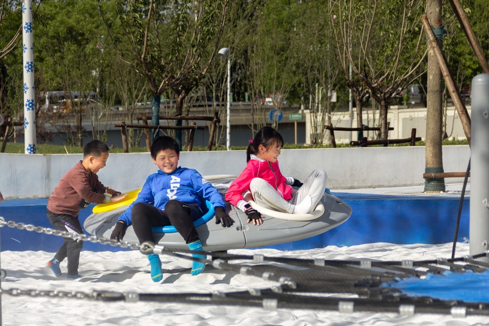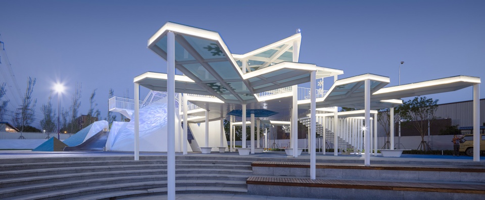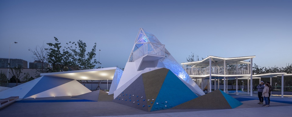 Looking south from Fushi Road, through the faint greenery, the structure in the shape of “snow mountain” and “snowflake” inspired by the elements of the Winter Olympics jumps out at you. Using snow mountains as the design inspiration for the ice and snow theme, for the use of different age groups, set up a safe climbing, slides and other game space, the use of the “snow mountain” image of the structure, the design of the viewing platform, the use of fog spray, projection lighting and other technological elements to create a dream scene of the ice and snow world.