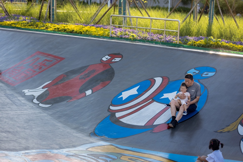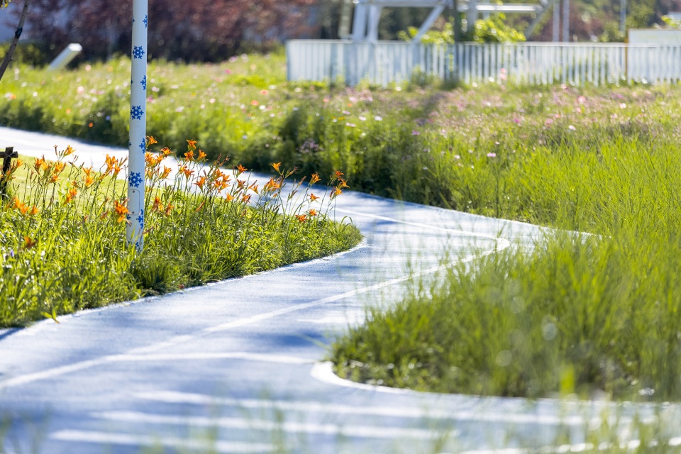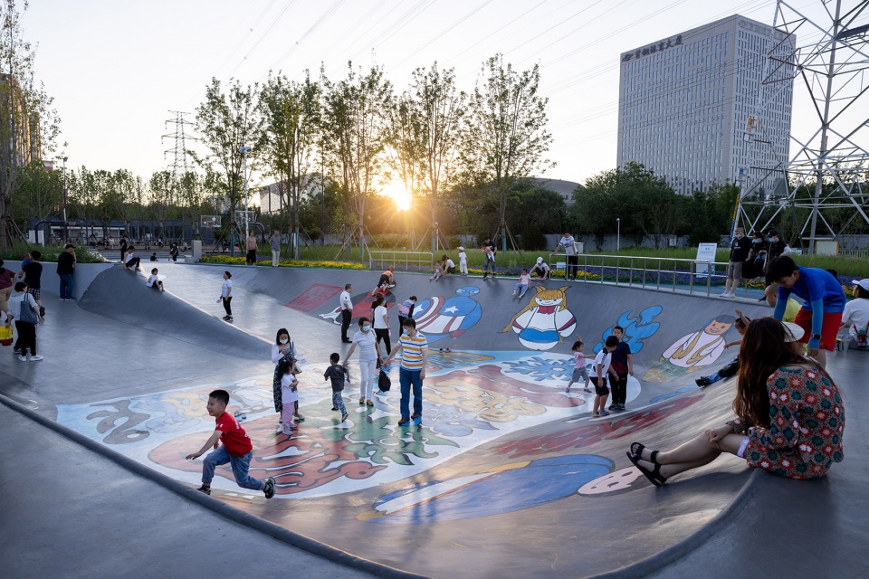 The sunset stretches out the shadows, and the laughter of children chasing and playing reaches far and wide from the unique street style art terrain. The staggered art terrain area creates a new gathering space for young people living around the area, with skateboards, roller skates, balance bikes, and various activities giving new life to the site.