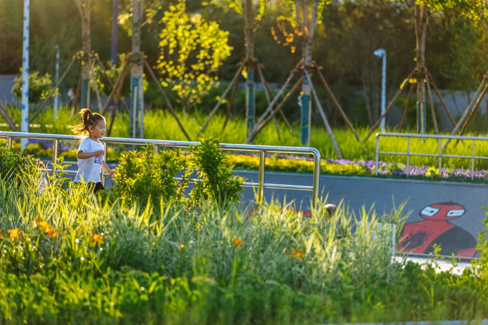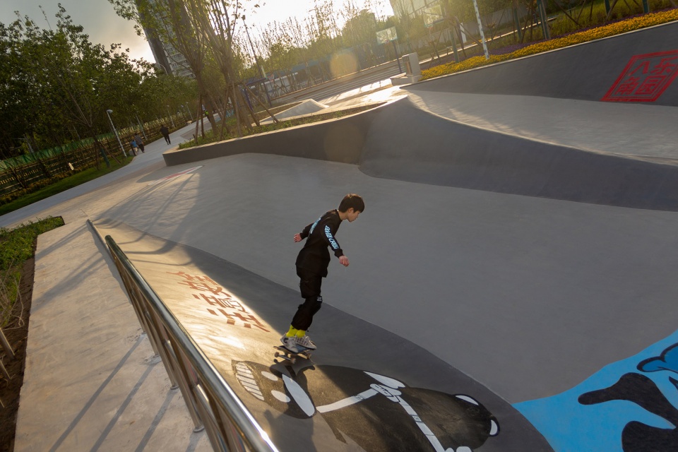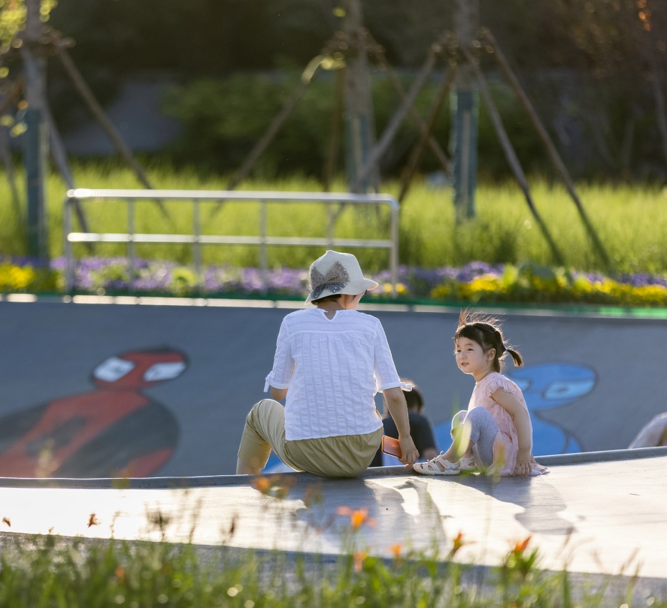 夕阳拉长了身影,孩子们追逐嬉闹咯咯的笑声,从独具街头风格的艺术地形区,传到了很远很远的地方。错落多变的艺术地形区为居住周边的年轻人创造出一个新的聚集空间,滑板、旱冰、平衡车,各式活动赋予场地新的生命。