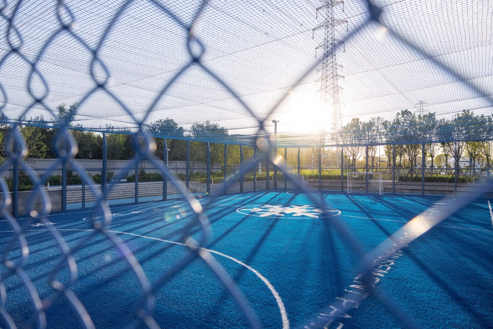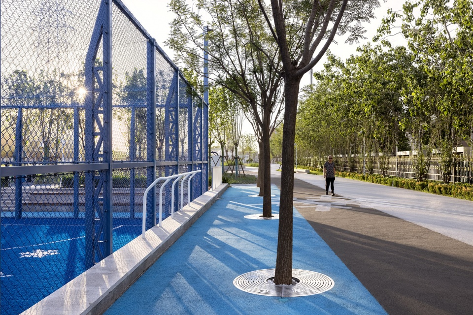 基于场地现状和舒适感测试,在高压走廊的条件下,活动场地适合设计在下沉空间,或者借助棚、围栏、植物来拉开和高压线的视线距离,提供更有安全感的心理保障。环绕园区设置了400米长跑道,形成完整的跑步环线,并且用蓝色系塑胶铺装上搭配地面雪花图案,充分呼应了冬奥的主旋律。微风吹过,树叶摇曳,人们游走在无限绿意之中,自由而放松。