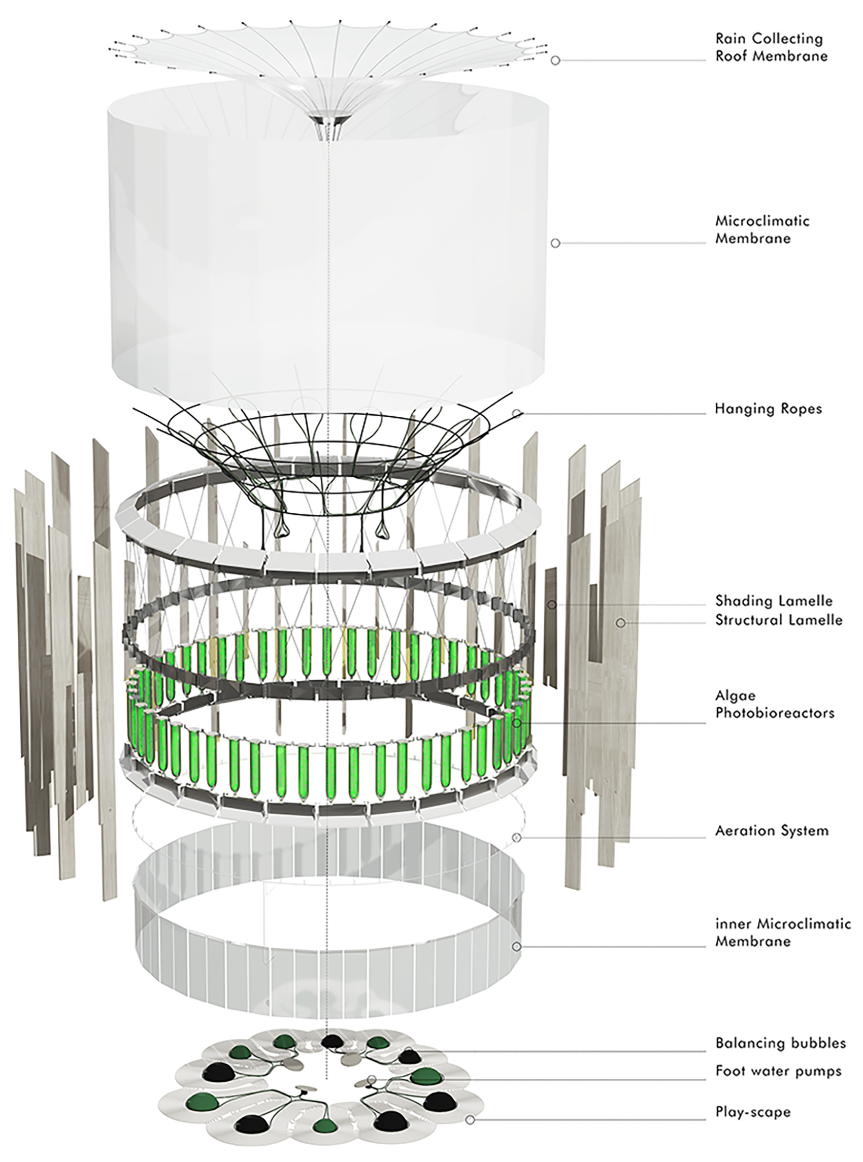 AirBubble invents a new architectural typology. It incorporates a cylindrical timber structure wrapped in an ETFE membrane protecting 52 glass algae reactors. This creates a real urban algae greenhouse. The space is equipped with ropes, foot pumps and bouncy spheres, and can function as both playground and outdoor classroom. The white bubbling noise of the algae gardening system masks the surrounding urban noise to provide a calming atmosphere in which to play and interact.