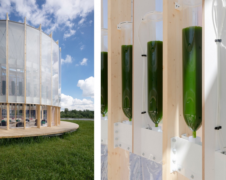 ▼圆柱形的木制结构被ETFE膜包裹,为52个玻璃材质的藻类反应器提供了保护