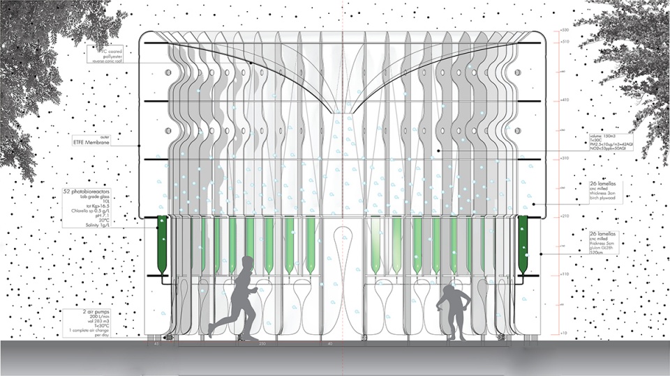 “AirBubble”展示了一种新的建筑类型:圆柱形的木制结构被ETFE膜包裹,为52个玻璃材质的藻类反应器提供了保护,形成一个真正的城市藻类温室。空间中配备了绳索、脚踏水泵和弹力球,可以作为游乐场和户外教室使用。藻类花园系统产生的白色气泡噪音掩盖了城市的喧扰,营造出一个可供游戏与互动的平静场所。