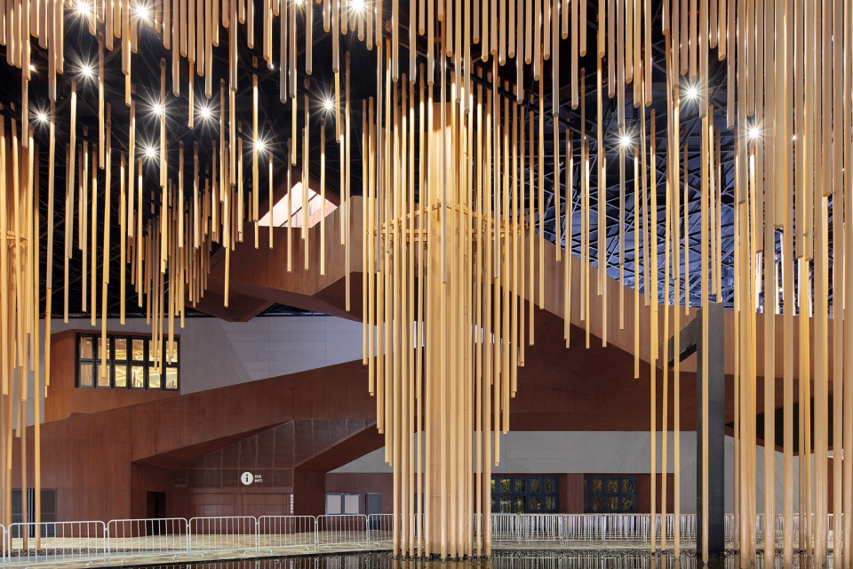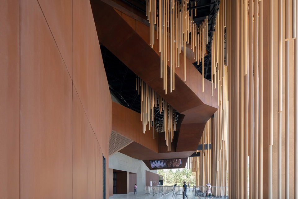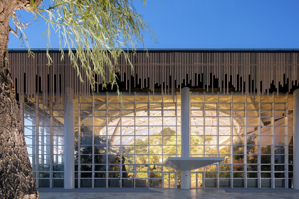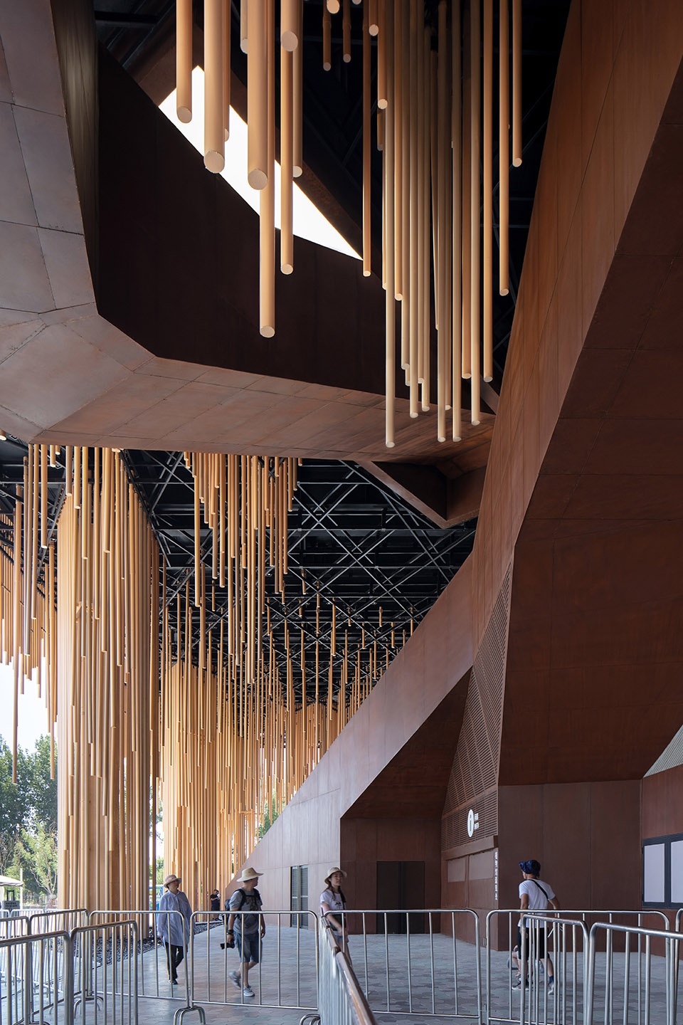 有别于一般温室的开门见山,植物馆的温室藏在东侧由“升起的地平线”营造的排队等候空间背后,灰空间内垂悬的“根须”隐喻着植物丰富的根系,其神秘的造型对观众有着强烈的视觉吸引力,也为在漫长夏季里户外排队的观众提供了人性化的遮荫场所,使观众在排队时不会感到乏味,反而充满了好奇和渴望。