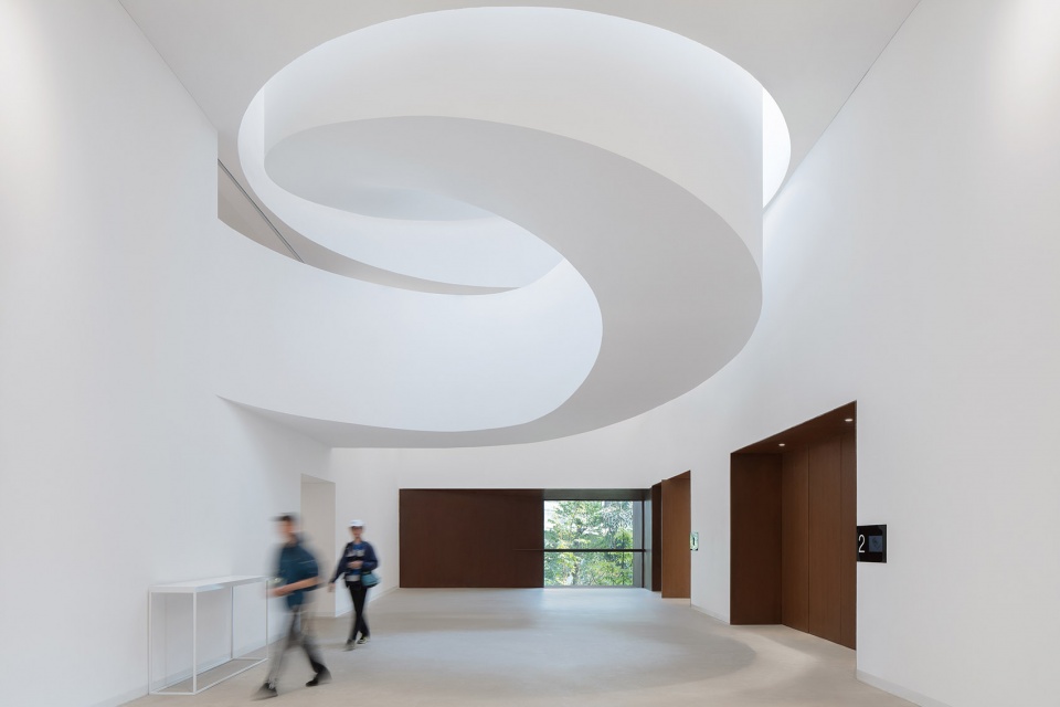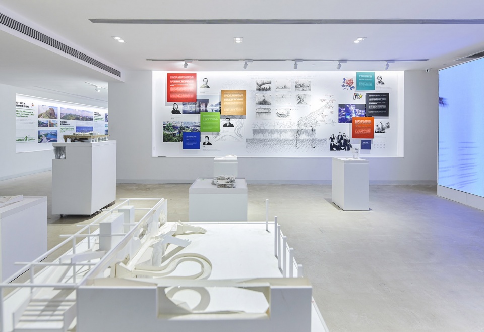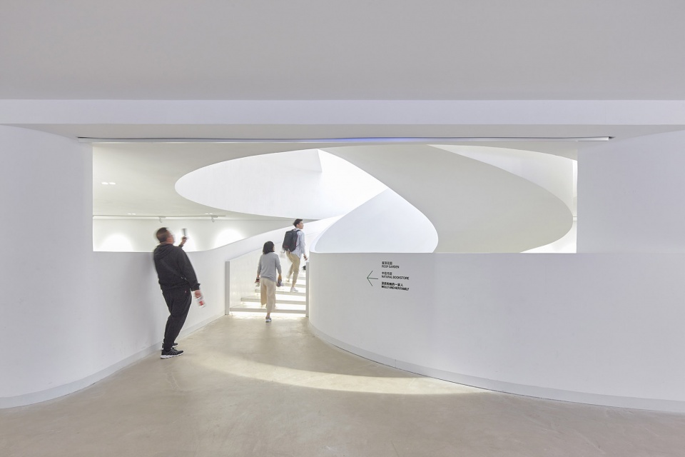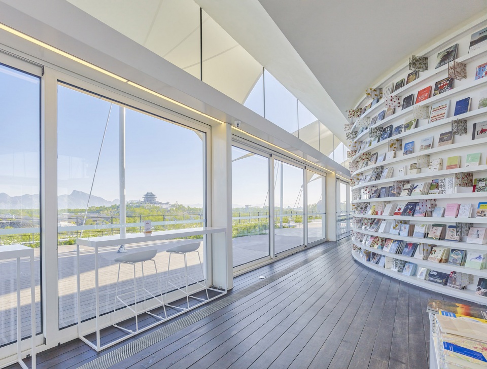 The major route passes through the treetops, bringing the audience back to the indoor exhibition hall. The path continues to circle up until reaching the top floor of the building, where the audience will find a bookstore, gift shop, and cafe. On the rooftop, visitors can experience a panoramic view of the entire park. This also provides a dramatic view of the Guishui River and Haituo Mountain as well as an overlook back to the greenhouse from a different perspective.