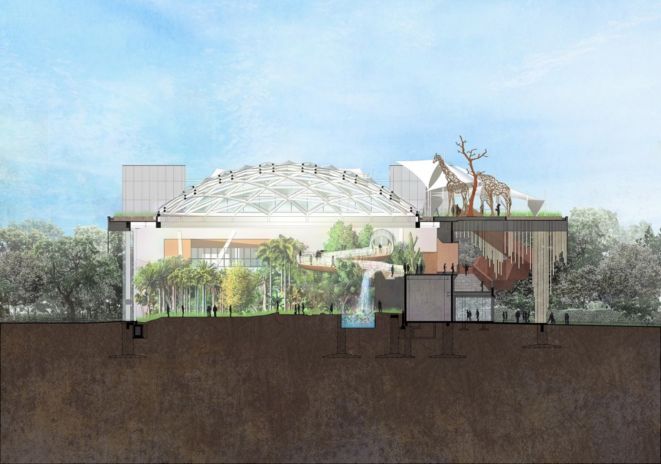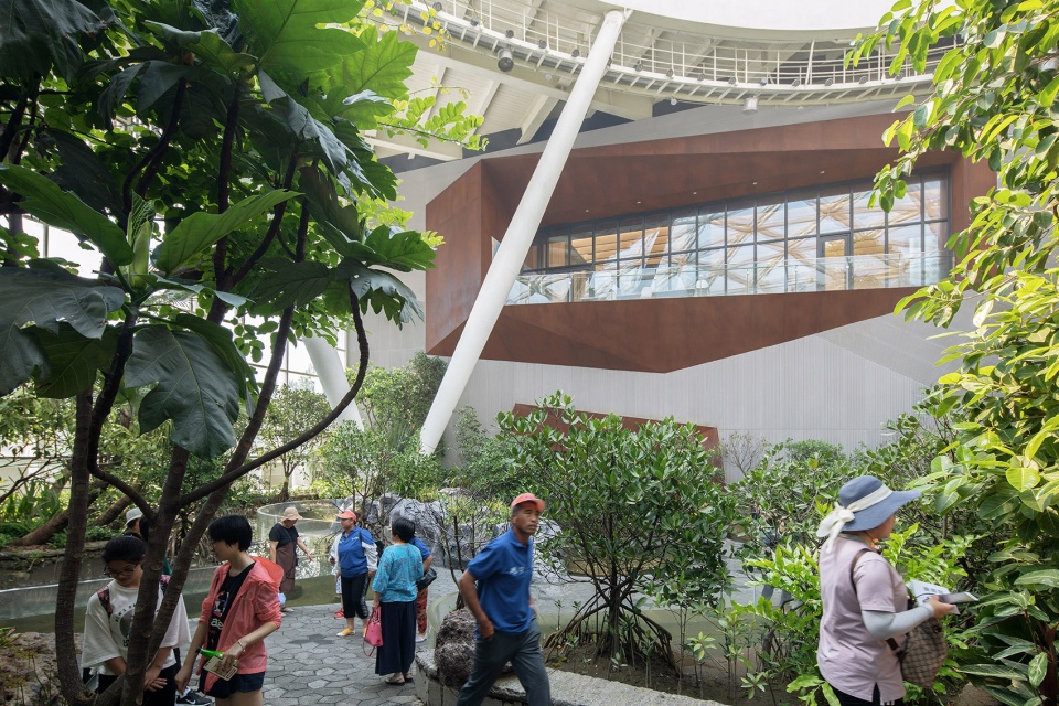 A tourist attraction point located on the rooftop is a sculpture of giraffes called “Molly and her family”. The sculpture was designed by James Doran-Webb and is made of Molave wood. Following the steps down brings the audience to a lighting show depicting the process of photosynthesis. The show presents the entire growth process of the mangrove from a seed to a tree and its relationship with its environment. It is designed to remind people that human society depends on plants and that people should treasure and protect nature.