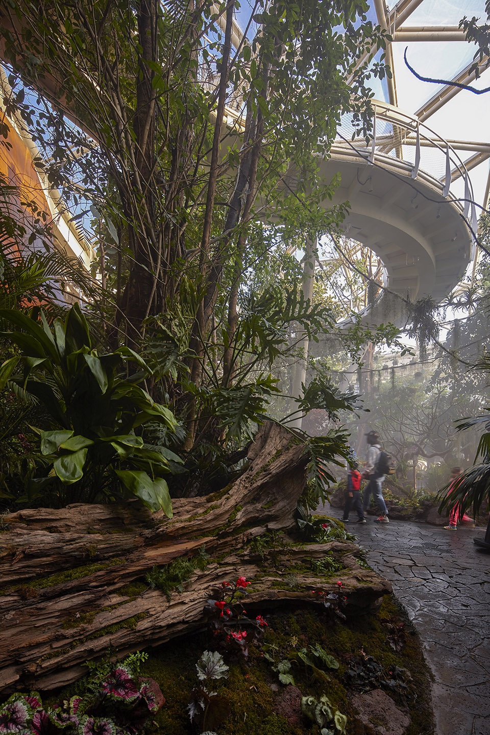 观众从展厅进入到大温室后,将先穿过能够演示潮汐变化的真正的红树林,再走过一系列主题区域,零距离地体验植物繁衍、求生、防御、传播、抗争、诱惑等种种生存的智慧。游客沿着温室内的路径可以一直盘旋到空中,全方位地考察从植物根部到顶部的智慧。