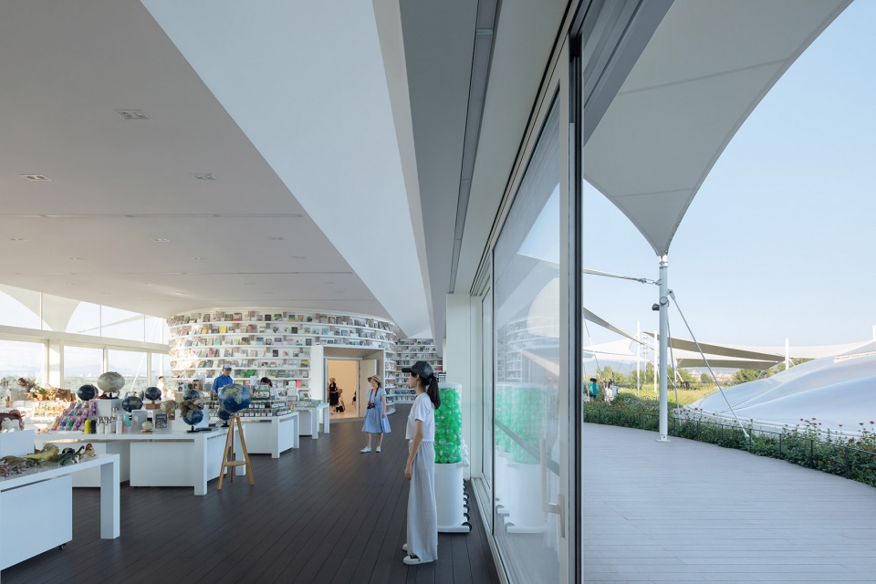 主展线穿过树梢,再次把观众带入到室内展厅,通过通向天台的螺旋楼梯达到顶层的书店、纪念品店和咖啡厅。游客在屋顶平台上可以远眺妫河和海坨山,环视世园会全景;俯瞰又可以回味室内温室。