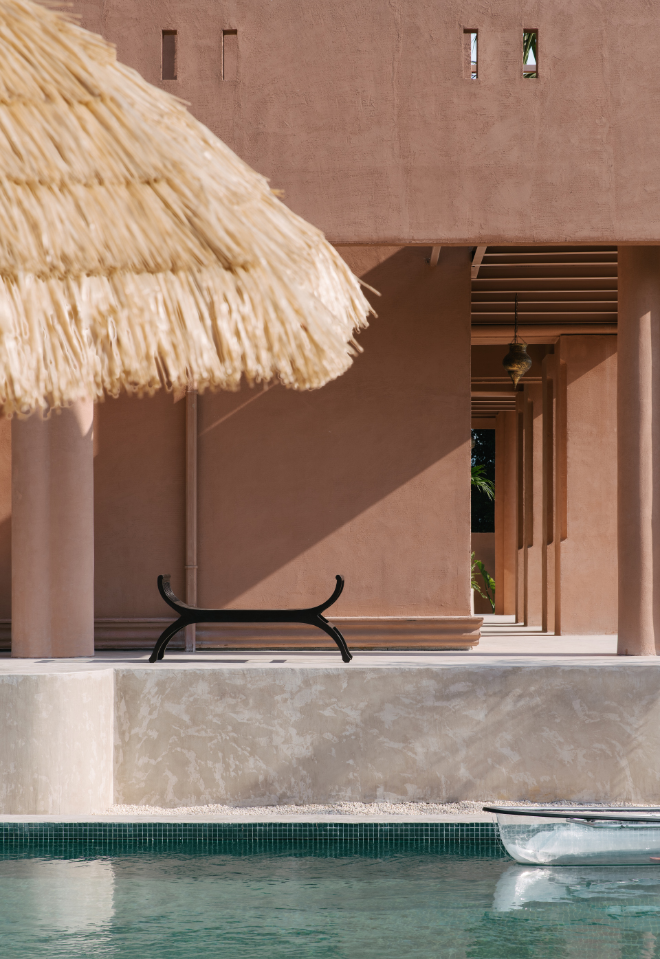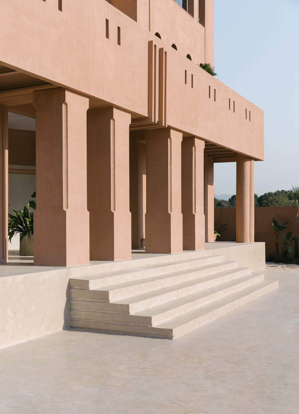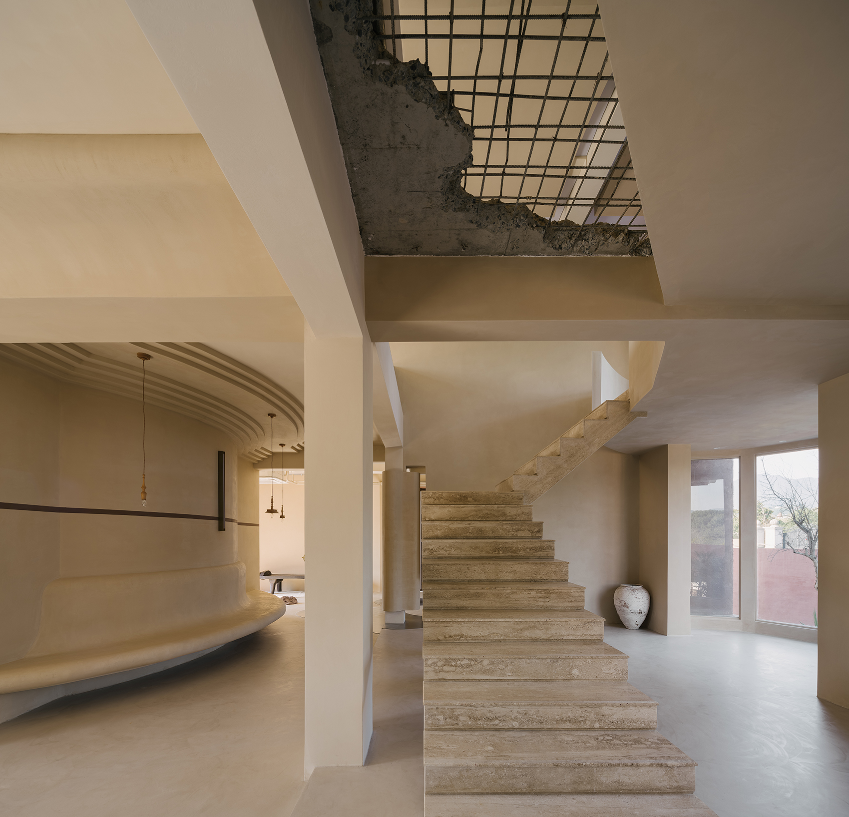 建筑外墙部分,随色相推移我们取暖色来营造整体氛围。回廊根据自然情境将室内外空间连结在一起,随着天气以及白昼时刻的变化,整体建筑立面造型呈现出丰富的光影结构。阳光和水是相对互补的元素,在建筑的西侧,蓝色的蓄水泳池以水平拓展的方式缓缓展开,融入山石和绿植中。