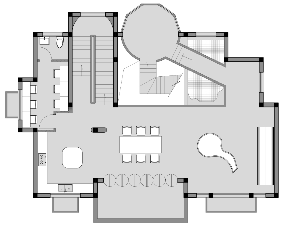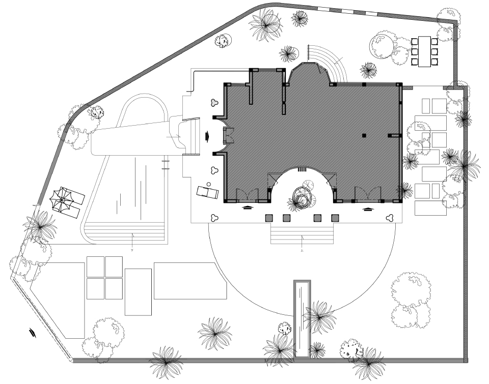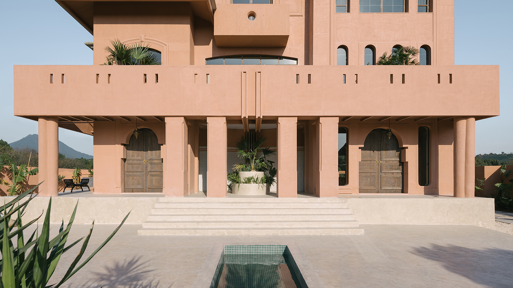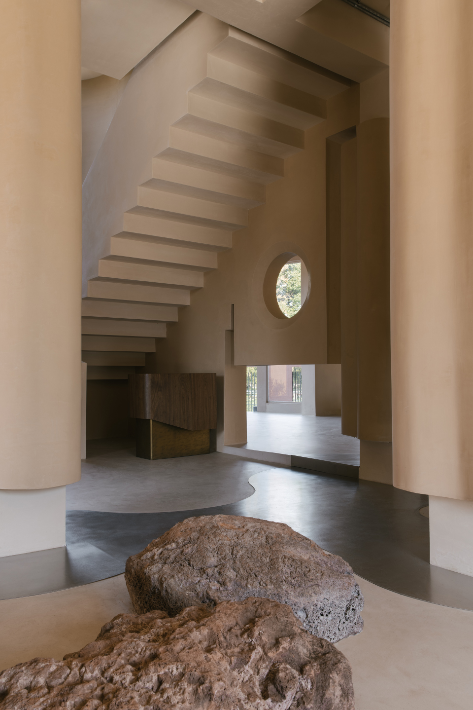 建筑外墙部分,随色相推移我们取暖色来营造整体氛围。回廊根据自然情境将室内外空间连结在一起,随着天气以及白昼时刻的变化,整体建筑立面造型呈现出丰富的光影结构。阳光和水是相对互补的元素,在建筑的西侧,蓝色的蓄水泳池以水平拓展的方式缓缓展开,融入山石和绿植中。