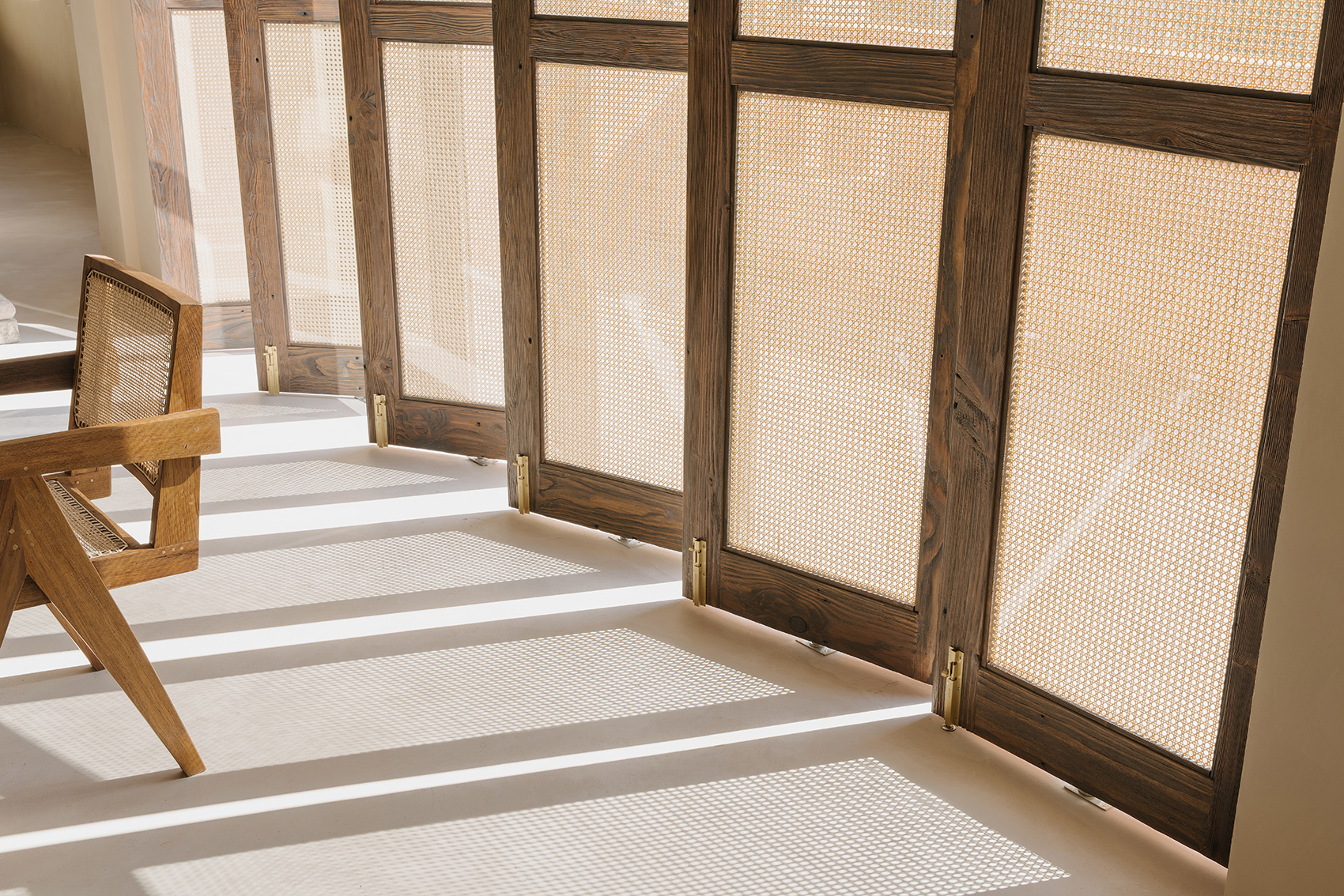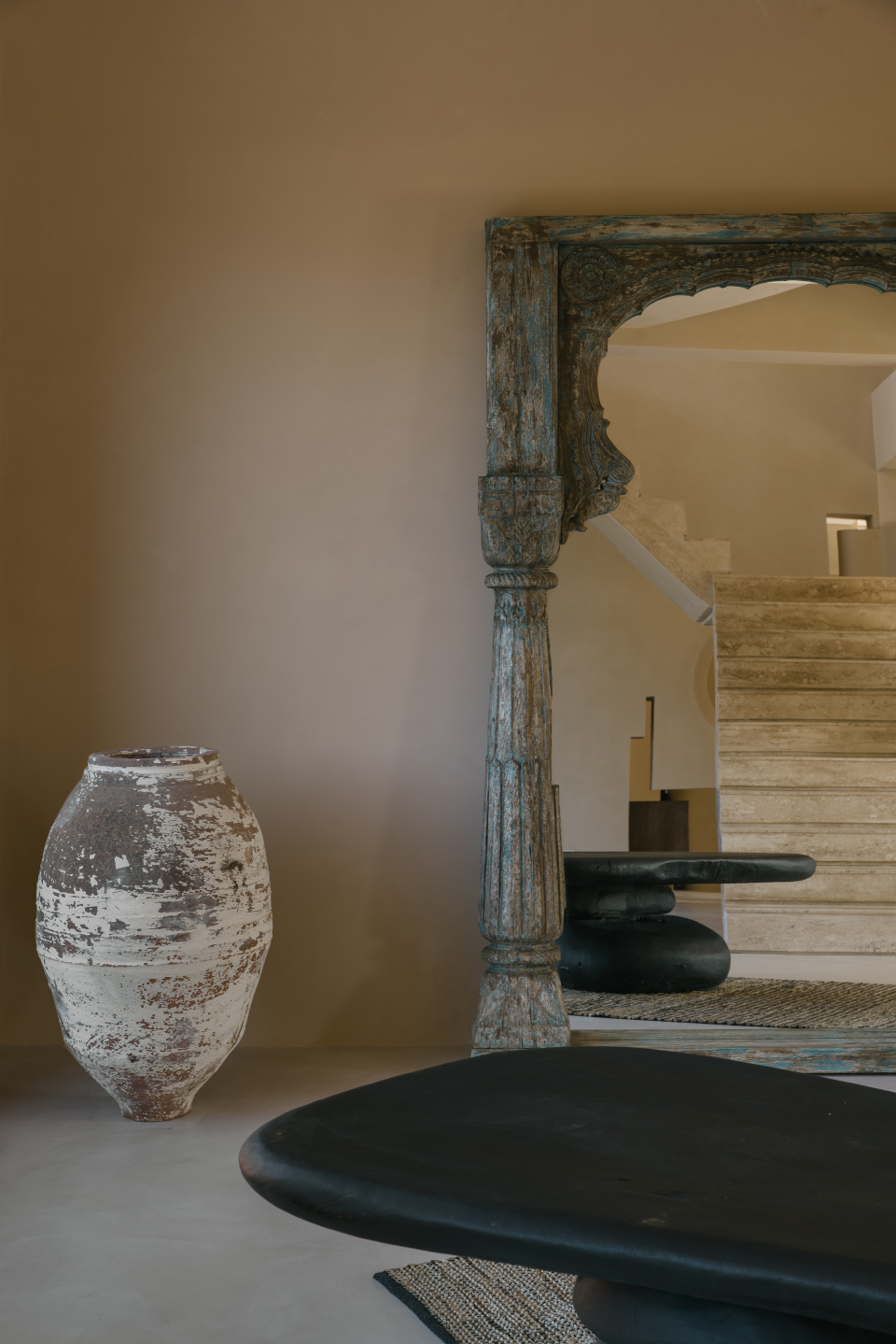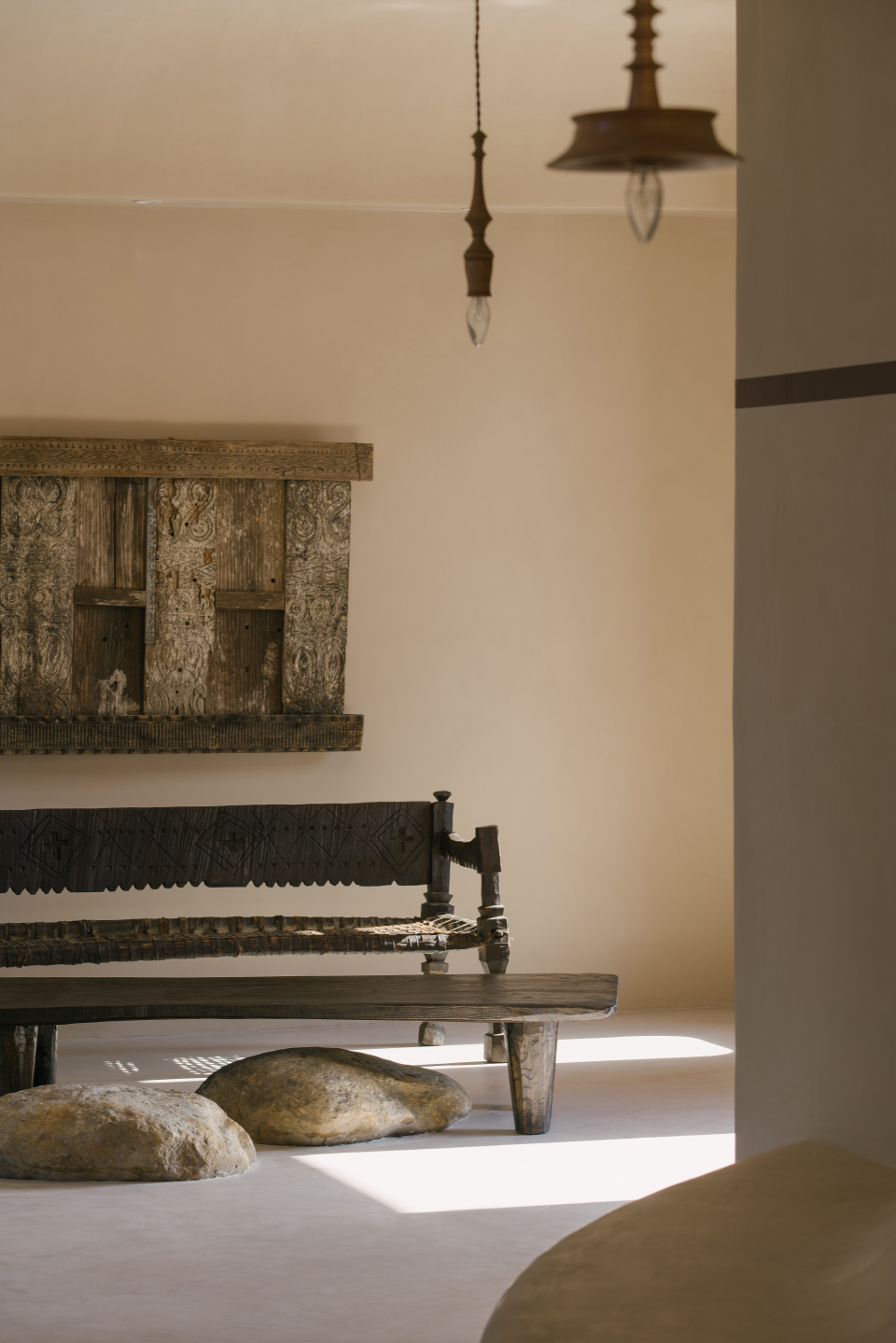 室内动态空间的组合通过区域穿行而得到不同的感知。我们在地面嵌入自然原石,与室外的自然景观相互贯通,古老的家具和早已风化的木材通过相对平静的墙地面得以完美展现。